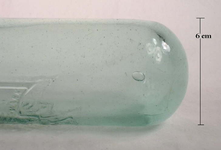 The base of a dip mold bottle will be very similar in appearance to a free-blown bottle except that it will tend to be more symmetrical in shape with little or no out-of-round distortion. However, this is often hard to ascertain and the best way to tell a dip molded bottle from a similar free-blown bottle is to look at the body and shoulder. Dip molded bottles will have a distinct discontinuity in the glass appearance right at the break between the the body and shoulder. This is shown distinctly in the picture at the following link - dip mold bottle shoulder. This is a dip molded ale or liquor bottle that dates from the 1850s. Dip molded bottles may also have embossing on the base as shown in the picture above which is a mid-19th century case gin bottle produced in a dip mold. The absence of mold seams (and embossing) on the bottles sides/shoulder but with embossing on the base is a fairly certain sign that the bottle is from a dip mold, or even more rarely, a turn or paste mold (discussed later on this page). Dip molds were most commonly used during the first half of the 19th century (and before) with little use after the early 1870s (Wilson & Wilson 1968, Jones 1986). Dip molds are also covered in more depth on the Bottle Body Characteristics & Mold Seams page.