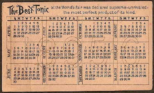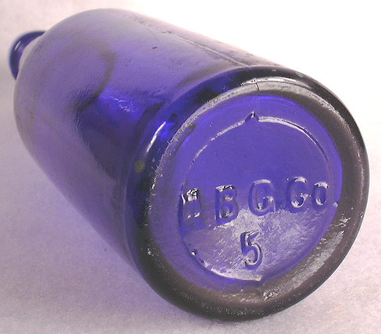The 1890s era trade card to the left advertises another popular brand of "Liquid Bread" that came in cobalt blue export style beer bottles. (David Nicholson was business linked with the Anheuser-Busch Brewing Company; see the Munsey article linked just below.) A distinctly blue example is shown in the right hand of the nurse (nun?!) pouring the contents into a glass for consumption by the injured potentate with his arm apparently in a sling. Liquid bread was a name for malt beverages which were purported to have health restoring qualities and low in alcohol (i.e., 3% or so); thus, it wasn't technically non-alcoholic "near beer." ("Malt tonic" was another common name for beer with a medicinal slant; a subject covered later on this page.) Click on the following links to view more pictures of this bottle: base view; close-up of the shoulder, neck, and finish which also shows the turn mold induced concentric rings. Cobalt export beer bottles are fairly common during the 1880s to early 1900s and apparently were only produced in the "pint" (~12 oz.) size. (Note: Dr. Cecil Munsey has written an excellent article on the "Liquid Bread" bottles which is available at this link: http://www.sha.org/bottle/pdffiles/LiquidBreadMunsey.pdf )