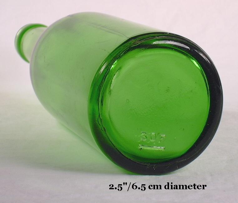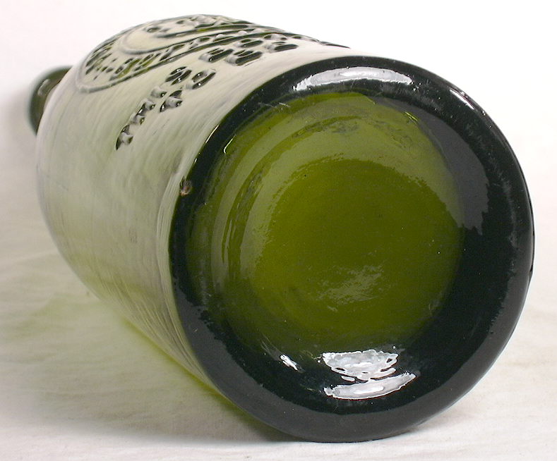 Of interest, export beer bottles were often used (or more likely re-used) for soda, cider and sarsaparilla, at least in the frontier West where bottles of any type were likely in short supply during much of the 19th century. Click on orange cider "export beer" label to see the fragmental label on a "quart" export beer - similar to the bottle to the left - found at the historic Fort Bowie (Arizona) that dates from the 1880s. It notes that the product last contained in the bottle was orange cider. (Pictured bottle in the National Park Service's Ft. Bowie collection, WACC, Tucson, AZ.) All of the partially labeled export beer bottles with soda, sarsaparilla, or cider labels found at Fort Bowie were from an unknown Lordsburg, NM. bottling company (Herskovitz 1978). During Prohibition the export beer style was also used for non-alcoholic "near-beer" and other such cereal based beverages (sans alcohol). Click PEP Cereal Beverage to view a 1920 ad from the Omaha Druggist (a trade publication) showing a dark glass export beer bottle used for their "non-intoxicating cereal beverage." It also noted that "PEP is sparkling over with life - has plenty of snap - the delightful hop flavor and rich creamy foam that you like so well" as well as "PEP is the one cereal beverage that will fool the old connoisseurs who have said "it could not be done." Sounds...great. The export style appears to be an evolutionary development from the tall, relatively slender black glass ale/spirits type bottles, like the last bottle pictured in the section above and that pictured at this link: tall dip mold cylinder (this bottle is discussed on the "Liquor/Spirits Bottle" typing page in the "Cylinders" section). Both bottles are only slightly different than the typical late 19th/early 20th century export beer bottle pictured to the left with the exception of color; export style beer bottles are infrequently (though, of course, occasionally) seen in black glass or shades of true green. Other names for this style are few as the majority of glass makers used the term "export beer" to describe this shape (IGCo. 1903, 1911, 1920; Bellaire Glass Co. ca. 1905; Cumberland 1911; Obear-Nester 1922; Fairmount 1930s). However, some glass makers called the style the "bulb-neck beer" and others simply called it the "beer bottle shape" (Swindell 1902; Alther 1909; Wilson & Wilson 1968). The export style of beer bottle has a body length that is usually equal to or a bit taller than the height of the shoulder, neck, and finish combined. They usually also have a somewhat distinct though variable bulge to the neck and a relatively slim to moderate diameter body. The bulging neck is thought by some to be a way to deal with the foam (when pouring or bottling?) though that is a debatable point. More likely the bulging neck is simply just a stylistic feature that was esthetic, popular, and traditional, as shown by the noted precursor bottles. The shoulder of the export style is distinct but short and fairly sharply angled in from the shoulder to where the neck begins; see the export bottle pictures here and compare to the "champagne" style that follows. The export shape is strongly linked to lager beers which were first bottled around 1872-73 (Wilson 1981). Early bottle makers catalogs listed export beer bottles in a limited range of sizes, though often with several sizes within the sizes available. Confusing? For example, the Illinois Glass Company's 1906 bottle catalog includes 4 different "pint" export beers (11, 13, 14 and 16 oz.) and three different "quart" bottles (two molds that held 26 ozs. and one that held 30 ozs.). Click IGCo. 1906 catalog - pages 250-251 to see the actual catalog page (IGCo. 1906). Bottle makers would often call the smaller capacity bottles - smaller than the nominal name size - "scant" capacities and the full size the "full measure" version; both very descriptive (Wightman ca. 1900). However, true quart size (~32 oz.) export beer bottles are occasionally encountered; see the images and description for the Upper Peninsula of Michigan full quart bottle noted later in this section.