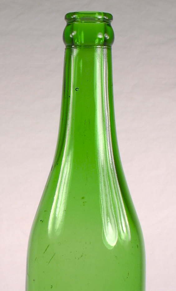 Almost all of the earlier (pre-1895 to 1900) mouth-blown champagne beers have variable blob finishes, like the first three bottles pictured here, with occasional crown finishes by the mid to late 1890s. A crown finish is pictured on the bright green bottle in lower left corner of this box. Unlike the export style, mineral finishes are very unusual on the champagne style even in the earliest days (Blumenstein 1963 & 1965; Sellari 1969-1972; Lincoln 1970; Martin 1973; Anderson 1973; Feldhaus 1986; & others). By the very early 1900s crown finishes became increasingly popular so that by the mid-1910s that finish/closure dominated beer (and soda) bottles. Crown finishes are still seen on these style bottles today, though modern finishes/closures are more often external screw threads with a type of crown cap that screws off by hand (if one has a strong grip).