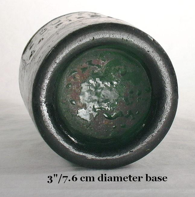 The bottle to the right is likely an early American (1840s) ale or mineral water bottle (picture from eBay® listing). This interesting bottle is free blown with a iron or improved pontil scarred base and has an early style of finish that is called an "inverted taper" or "tapered down" finish (Jones & Sullivan 1989; Mechow 2005, pers. comm. 2011). This finish is covered briefly on the Bottle Finishes & Closures: Part II - Types or Styles of Finishes page as a separate finish type as it has been observed with some frequency on bottles attributed to the glassworks in the Pittsburgh, PA. area (von Mechow 2005). Of course, without some type of positive identification (label and/or embossing) there is no sure way to determine to what use this bottle was actually put and it could have been used for spirits, medicines, or many other liquid products although these types were also also used for products that diverged greatly from the usual liquid contents including use for caraway seeds and ground pepper (McDougall 1990).
