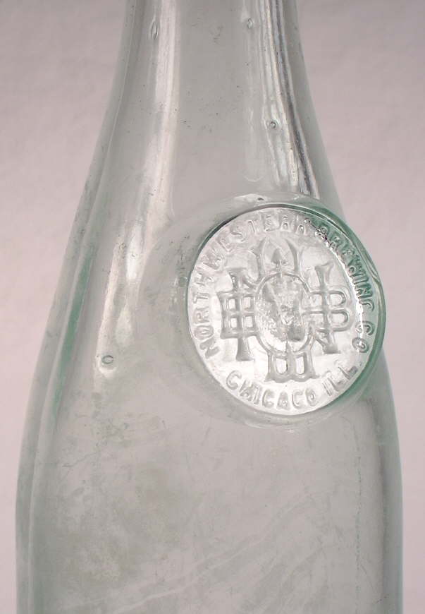 finish. The "quart" (approx. 25 oz.) aqua champagne style beer bottle pictured to the right is embossed NORTH WESTERN BREWING CO. / CHICAGO, ILL. with a monogram that includes a buffalo head, inside of a raised circle (likely plate) on the shoulder. This bottles base is also embossed with S. B. & G. Co. indicating manufacture by the Streator Bottle & Glass Company (Streator, IL.). This beer bottle has a Baltimore loop seal closure accepting finish. Click Bottle Finishes & Closures, Part III: Types of Bottle Closures to move to the section of that page which covers this closure type. This bottle also has a tooled blob finish (with the distinctive Baltimore seal "groove" inside the bore), multiple air venting marks on the back shoulder, and was produced in a post-bottom mold. This company was in business with this name from 1888 to 1909 (Bull et al. 1984). The makers mark and company information in combination gives a pretty positive date range for this bottle of 1888 to 1905, entirely consistent with the manufacturing features noted. Click on the following links to view more images of this bottle: base view showing the makers mark; close-up view of the embossing and shoulder. Streator's cross-state rival the Illinois Glass Company (Alton, IL.) offered a very similar champagne style "Monogram Beer" in their early 20th century catalogs, though this shape of bottle also fits the "select" beer style definition noted earlier. Click IGCo. 1906 catalog - pages 254-255 to view an almost identical bottle which was offered with any finish (including the Baltimore seal) and as a plate mold like this Streator example.