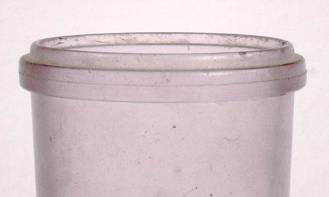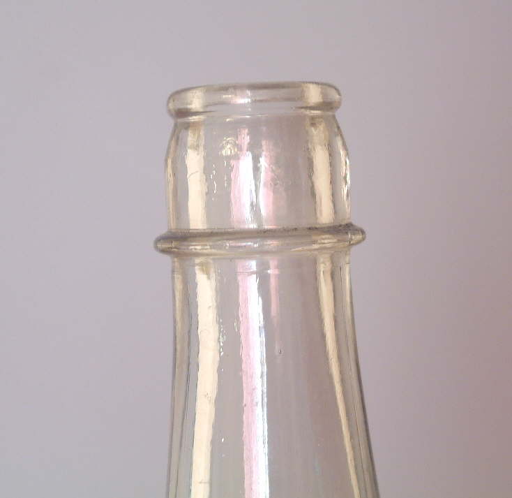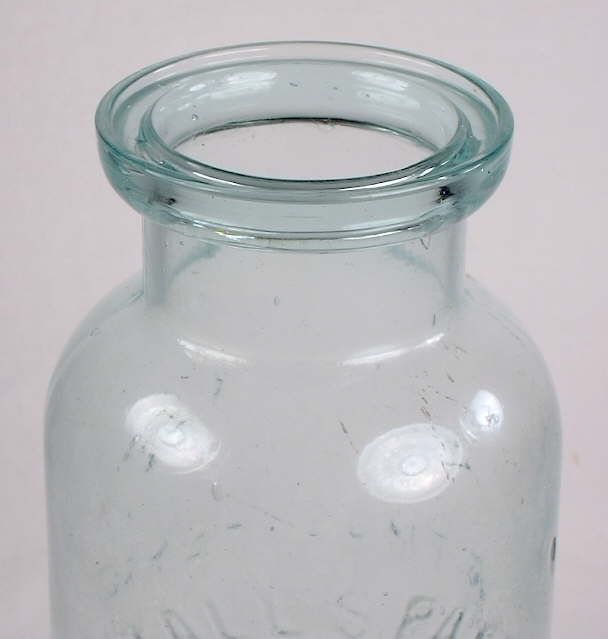 This finish/closure is very diagnostic of all shapes of milk bottles (cylindrical, square, and rectangular) and is usually seen on milk bottles dating from the 1910s up through the 1950s but can occasionally be found on some milk bottles dating back to the 1890s, as the 1899 advertisement above shows. Click Empire 1901 patent milk bottle to view an early 20th century (1901-1910) mouth-blown half-pint milk (cream) bottle that has a tooled capseat finish. There appears to have been some limited use of this type finish on a few other types of bottles, most notably food bottles made during the first third of the 20th century. Even though the finish has the edge inside the mouth, whether these bottles used the ligneous cap or not is questionable.