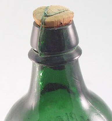 The picture to the right shows an alcohol laced (18%) medicinal bottle (Ferro-China-Berner Tonic) with the full contents and sealed with a foil capsule over the cork. This bottle dates from the early 20th century. Click Ferro-China-Berner tonic bottle to view a picture of this entire bottle, which the label states is from New York, though the bottle (and possibly contents) were probably manufactured in Europe. A similar cork sealing method was to dip the corked finish in hot wax instead of a foil wrapper (Jones & Sullivan 1989).