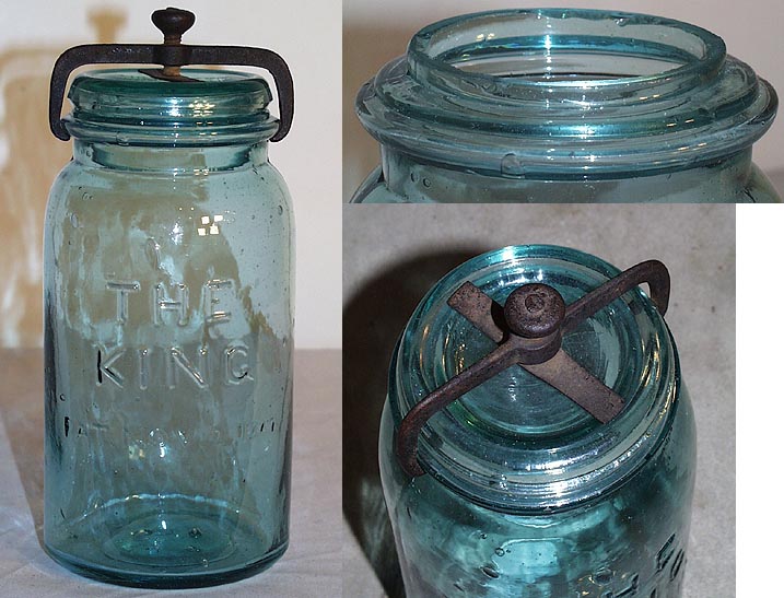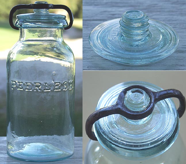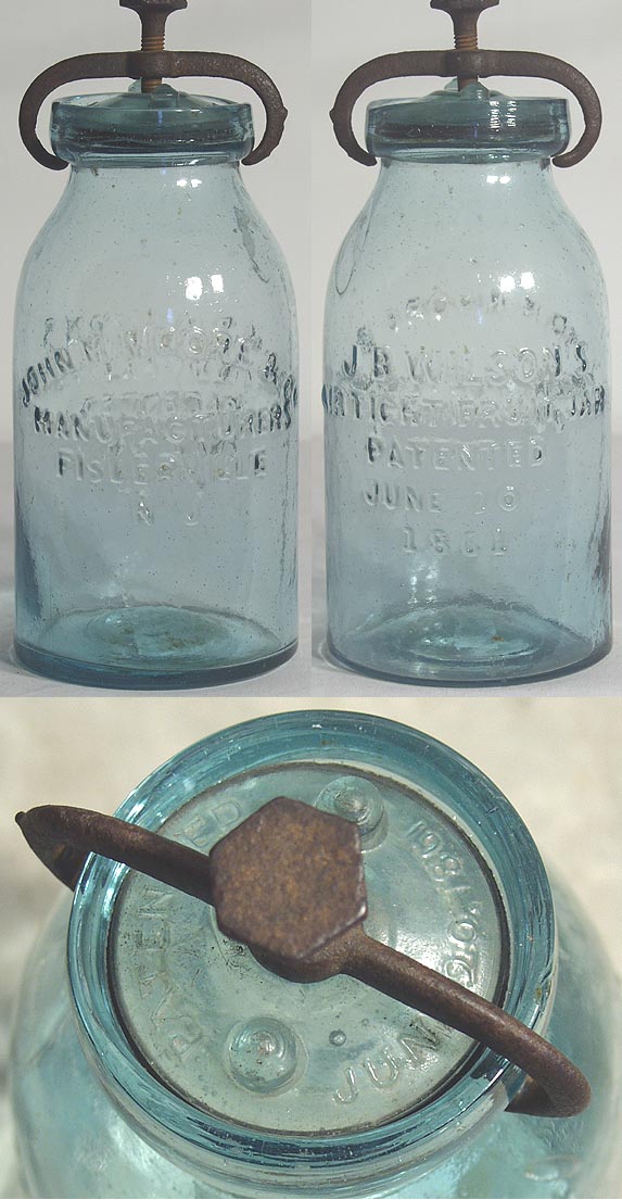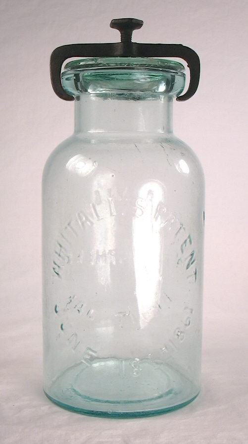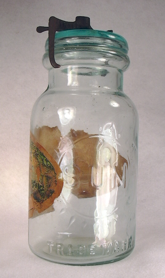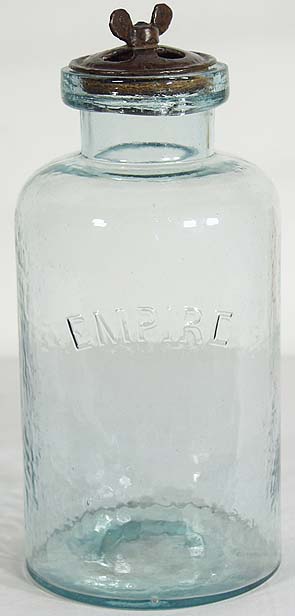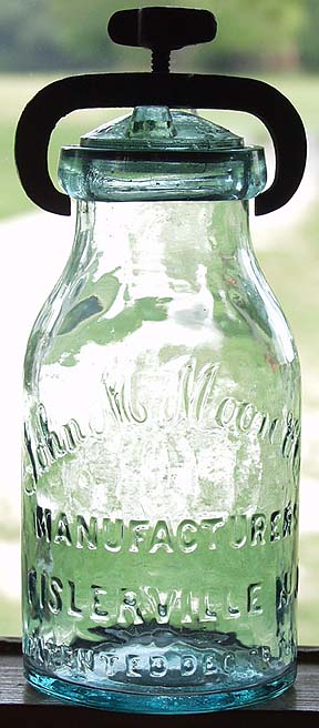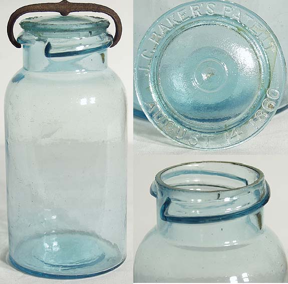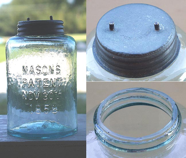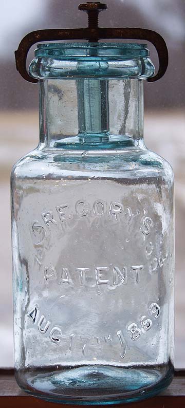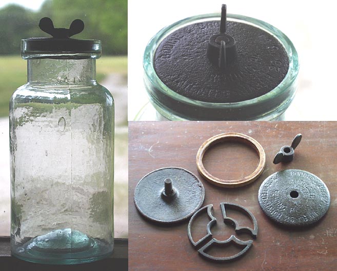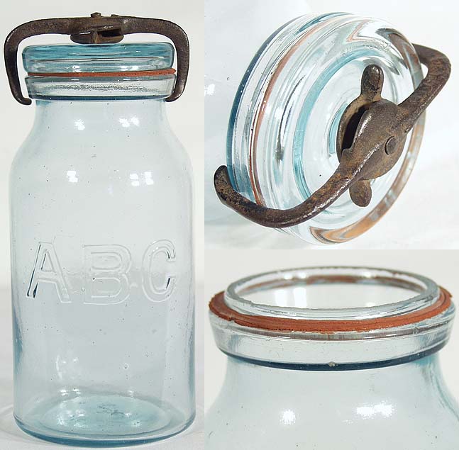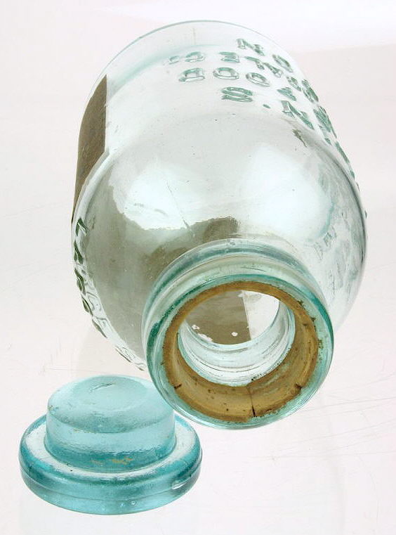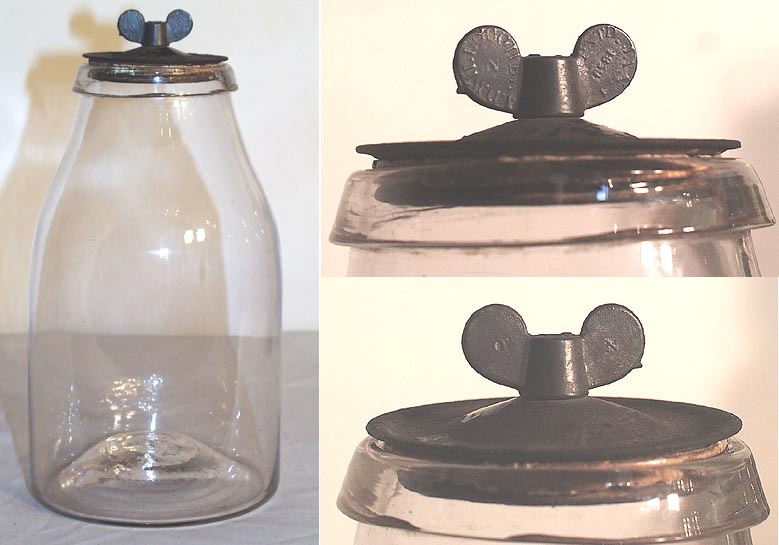The use of bottles - and the need for varied closures to seal them - arose with an expanding city based market and even then for just a few types of bottled goods - primarily liquor, wine, and patent medicines in the early 19th century. As cities and relative affluence spread, the market and demand for bottled goods increased rapidly. At the same time, the expansion of the ever growing population into the farming regions of the Midwest created a need for methods and equipment to preserve foods. Thus, the need for canning jars. With the expansion of these demands came the need for suitable containers all of which had to be properly sealed to function. Parallel with the creativity of bottle & jar makers in satisfying this demand for glass containers, the creative juices of closure designers were unleashed. The thousands of different closure designs patented during the 19th century are a testament to that creativity, though most probably never made it into widespread manufacture (Lief 1965; Toulouse 1969a). This variety is illustrated later on this page with links to several dozen canning jars exhibiting a kaleidoscope of closure types most of which saw very limited popularity and use.