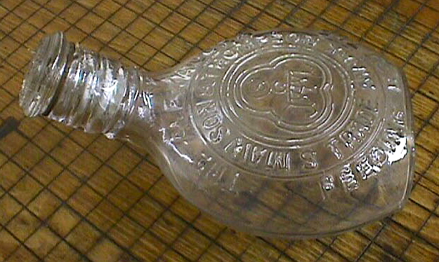 These flasks are always mouth-blown and when made in the pint size in amber glass they date between 1877 and about 1880. In the pictured half pint size in colorless glass (sometimes amber glass) the flasks date from the 1880s and possibly 1890s (Wilson & Wilson 1968). These flasks are not often seen, but are common enough to warrant mention. It has also been established that these uniquely shaped flasks were made by glass companies outside of San Francisco since one example firmly dated from 1880, has Baker Bros. & Co. (proprietors of the Spring Garden Glass Works, Baltimore, MD.) embossed on the base along with regular base embossing noted earlier (Baab 2005). Since these flasks were always mouth-blown, the top surface of the external screw thread finish (the rim) is ground flat; click Newman finish close-up to view a close-up picture of the threads and ground rim.