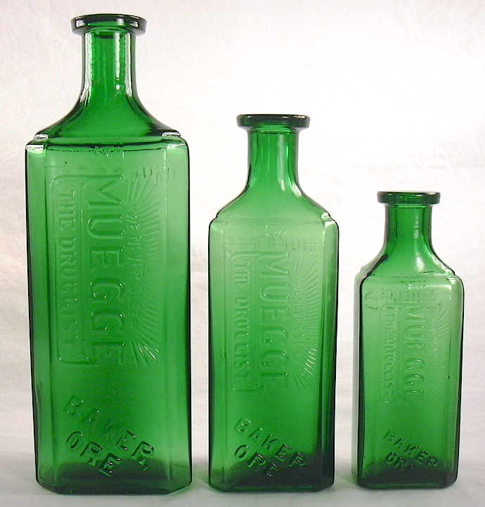 however: -The "Congressville" green illustrated by the Congress Water in the upper right corner is a color that is most often seen on "Saratoga" style mineral water (and some soda water) bottles - primarily from the Eastern seaboard (Tucker 1986). It is a color that was little if any used in the 20th century and only occasionally shows up in other types (non mineral water) of bottles, and then primarily 19th century items. -Similarly, the blue-green colors shown above are very uncommon on machine-made bottles and generally denote a 19th or very early 20th century manufacture. |