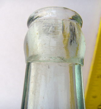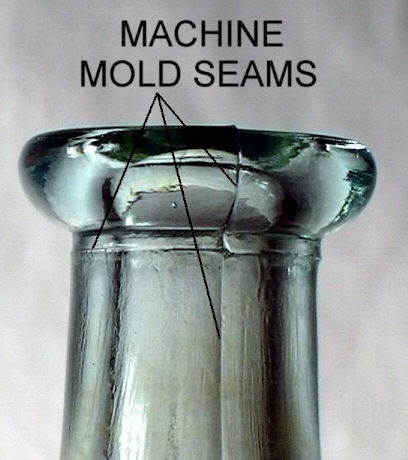 There are numerous diagnostic features that differentiate a machine-made bottle from a mouth-blown bottle. These characteristics were covered in the machine-made section of the Bottle Dating page; click on machine-made bottle dating for more information. The diagnostic features which virtually all machine-made bottle finishes share are related to the neck portion of the parison mold (i.e., ring mold) which holds the formative bottle-to-be. These features are described as follows: