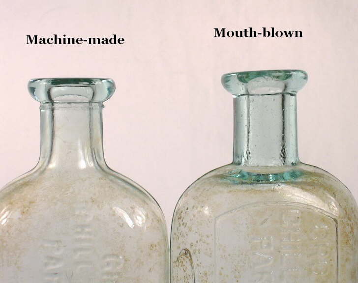 A Tooled (mouth-blown) to Machine-made Finish Transition Dating Example The following is an example of bottle dating related to the transition from mouth-blown to machine-made bottles. The examples used are both embossed identically as follows: GROVES TASTELESS / CHILL TONIC PREPARED BY / PARIS MEDICINE CO. / ST. LOUIS. ("Tasteless" was a reference to the lack of an era typical bad medicinal flavor, not a reference to the refinement of the purchaser.) The bottle on the right in each picture is a mouth-blown example with a tooled finish. The bottle to the left is a machine-made example. Unlike the Peruvian Bitters in the mouth-blown example above, these bottles were not and could not have been produced in the same mold. The two manufacturing methods are too different for the same mold to function in both manufacturing processes.