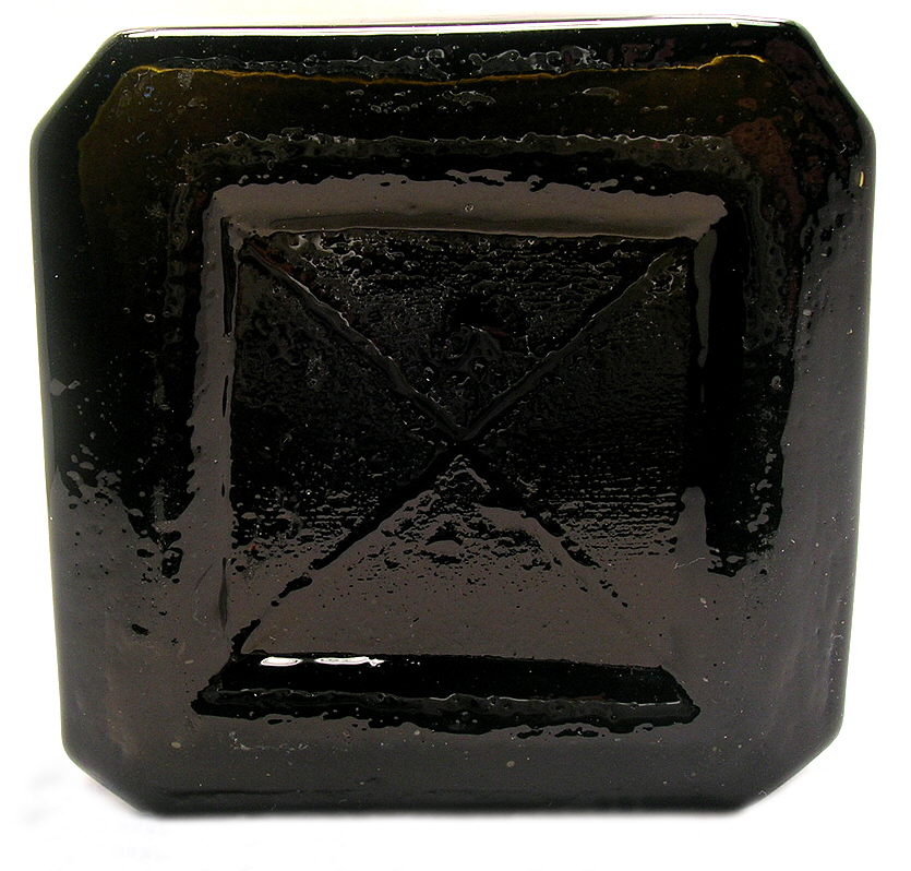 These type bottles are occasionally encountered on American historic archaeological sites, though most of the crudely made, burst-off bottles seen today were relatively recently imported from England for the American collector market. These cheaply produced bottles primarily date from the 1890s to 1920s era when bottle machines were rapidly dominating the market and are reflection of the economic pressures that eventually overwhelmed factories that still used older methods (Wills 1974; Boow 1991). The image to the right is an example of a burst-off finish on an English ink bottle made during the early 20th century. The burst-off finish seems to infrequently occur on American made items from the mid to late 19th century; the rough surface was usually ground down - a process described below (Jones & Sullivan 1989).