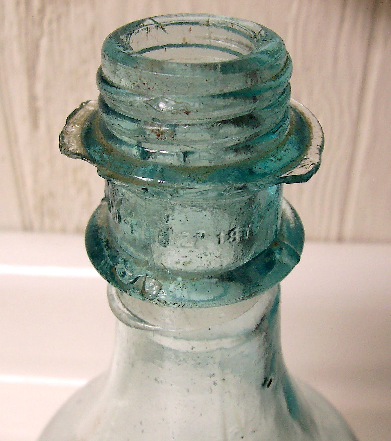 The pictured bottle has a finish that is about 2.25" tall and 1.25" diameter across the rim - a rim which is not ground down like other external screw thread finishes of that era would be (like Mason style canning jars). It also has two 180 degree opposite vertical side molds seams which do not remotely line up with the vertical side mold seams on the bottle itself. The middle of this unusual finish has the horizontal embossing PAT'D FEB. 27, 1877. A patent on that date was granted to one Samuel Oakman of Winchester, Massachusetts for "An Improvement in Molding Glass." This patent (click Oakman's February 27th, 1877 Patent #188,725 to view it) shows an external screw thread finish on a bottle and outlines the process and tool ("device") needed to form an applied finish. The finish and seams were formed by the "device" described and illustrated in the patent drawing. Specifically, the patent notes that it is for a "...a method of forming glass necks for bottles..." and that the "...invention is particularly designed for forming a strong screw-shoulder and neck on large glass bottles like "carboys"..." - the illustrated large bottle fitting that perfectly. As far as the process, the patent goes on to say that "... the neck of the bottle, still hot, is inserted (into the device); then the molten glass is placed in the well (of the device)...and the whole put under a press, the operation of which is to force the plunger (of the device) and drive the glass from the well onto and around the neck of the bottle, thus forming the shoulder...and screw." The "screw" is the screw threads; the "shoulder" apparently being the flange just below the threads - both of which are shown in the patent illustration, although the conformation of the "shoulder" is different on the pictured bottle than the patent illustration. Although apparently unrelated to the 1870 and 1871 patents, this unique and unusual bottle does prove that applied external screw thread finishes were sometimes used on very rare occasions. Thanks Henry for a bottle mystery solved! |