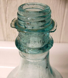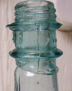 To the right is an illustration from an 1876 patent which shows a typical calipers type finishing tool used to create a type of applied, one-part "blob" finish used for carbonated beverages. (Click J. Lamont's May 29, 1876 Patent #183,267 to see the entire patent.) The blob finish and upper neck of the bottle is visible being held between within the "jaws" of the calipers type finishing tool which is otherwise quite typical of the tools used to finish bottles from at least the 1840s until the end of the mouth-blown bottle era. Blob finishes are most commonly found on soda and mineral water bottles from the 184s through the end of the mouth-blown era (1920 or so) and beer bottles from the 1870s into the 1910s. This style was occasionally but not commonly used on other types of bottles including patent or proprietary medicines and even a few figured flasks dating from the mid-19th century. McKearin & Wilson (1978) called this finish a "tooled, rounded rolled-over collar" on figured flasks. The wide period of use precludes any general dating conclusions simply based on the shape; other diagnostic features must be used, including the bottle type itself. See the Bottle Typing page for more information. The tooled "funnel" shaped blob finish to the left is on a Mt. Hood Soda Water (Portland, OR.) that dates from around 1906-1911 (Fowler 1981,1998; Elliot & Gould 1988). The base of this bottle has an three digit mold mark (362 / H) which was thought to be a makers mark for the Holt Glass Works, which was allegedly destroyed by the April 18th, 1906 San Francisco earthquake (Toulouse 1971; Thomas 1998). However, that has since been found incorrect as the company expired in the 1890s long before that famous event. See the following link on this site for more information on Holt: https://sha.org/bottle/pdffiles/Holt.pdf This bottle also still has the wire Hutchinson closure in place - see Part III - Types of Bottle Closures for more information. (Note: There is possibly some dating refinement to be had related to the subtly varying conformation of blob finishes on Hutchinson sodas - at least in the Western US. For more information, consult Elliott & Gould's 1988 book entitled "Hawaiian Bottles of Long Ago" for more on this subject. Although developed for Hawaiian Hutchinson soda bottles, it has application elsewhere since all Hutchinson soda bottles used in Hawaii were imported, and largely from the U.S. mainland. As an example of this dating potential, the aqua blob finish pictured above (Mt. Hood Soda Water) was classified by Elliott & Gould as a "funnel top" since the finish itself is somewhat funnel like in its taper from top to bottom. They note that this style was used on bottles known to be dating from 1905 into the early 1910s - a date rage that fits with noted the company history. Those authors believe that the funnel finish was introduced and used by the Pacific Coast Glass Company (California) - a likely producer of this Oregon soda.) The applied blob finish in the upper left corner (blue-green bottle) is on an early soda/mineral water bottle embossed The Excelsior Water (possibly from San Francisco, CA.) that was most likely made in 1850s based on the improved pontil mark on the base (Markota 1994). This style of finish on this shape of bottle (a "blob soda" shape, though most made had round bodies instead of 8-sided) was very common and these bottles were made in a wide variety of colors for use throughout the United States primarily between 1850 and about 1885. The "blob soda" style was, however, made as early as the 1840s and as late as the early 20th century (McKearin & Wilson 1978; Illinois Glass Co. 1908, 1911).