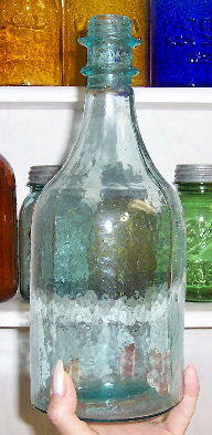 The blue-green tooled champagne finish to the immediate right is on a Colden's Liquid Beef Tonic (New York) that was likely manufactured between about 1890 and 1915 (Fike 1987). This bottle represents some of the variety possible in the use of this finish as it is shaped and finished like the champagne bottles of that era but actually held a food based medicinal product. Beef based "tonics", which claimed to have wide ranging medicinal qualities, were quite popular in the U.S. during the era that this bottle was made. These type medicinal "tonics" often included coca as an ingredient, helping explain the wide popularity of this class of medicines prior to more stringent federal regulations during the first third of the 20th century. Tonic properties indeed!