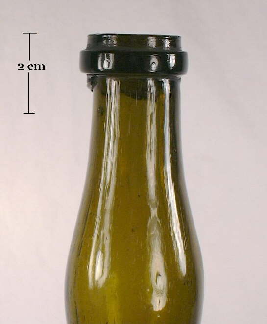 The flared ring finish - as illustrated in the IMACS - is somewhat similar to the champagne finish except that the band is rounded (not flat) and the lip or upper part above the band flares outward slightly at the bore. This is another two-part finish that is not often observed, at least on bottles within the date range covered by this website - American produced bottles from the 19th to mid-20th centuries. It could be considered a variation of the broad class of finishes known as string finishes (#35) which are often on bottles that are both non-American made and earlier than the era covered by this website. (For more information on early bottles that most frequently utilized this type finish - typically of English/Continental manufacture - consult the publication entitled Cylindrical English Wine & Beer Bottles 1735-1850 by Olive Jones (1986). In particular, see the Finishes and Necks section on pages 43-71. This entire book is now available as a pdf file on the Society for Historical Archaeology website at this link: http://www.sha.org/documents/Parks_Canada/Cylindrical English Wine and Beer Bottles - English.pdf ) The flared ring finish pictured to the left is on a European "onion" bottle (liquor) that dates between 1700 and 1730 (McKearin & Wilson 1978). This is a crude version of this finish style, but has the basic form. However, the age and origin of this bottle are outside the scope of this website, and thus it is not covered further. See string rim finish (#35) later in this section for more information. |
