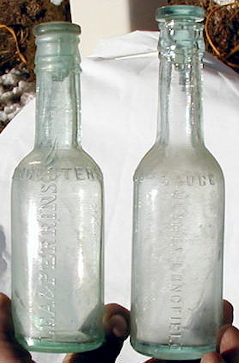 The amber tooled finish to the left with the matching glass stopper in place is on an Oregon Blood Purifier (Portland, OR) that dates from the 1890s. This shows that the general club sauce "type" finish can be found on other types of bottles. Although resembling the club sauce finish, this finish would be more accurately called a "three-part" reinforced extract finish (#10) since it is on a medicinal bottle and the upper part (lip) flares out wider than the rest of the finish. The majority of bottles found with this finish held Worcestershire or similar sauce products. |
