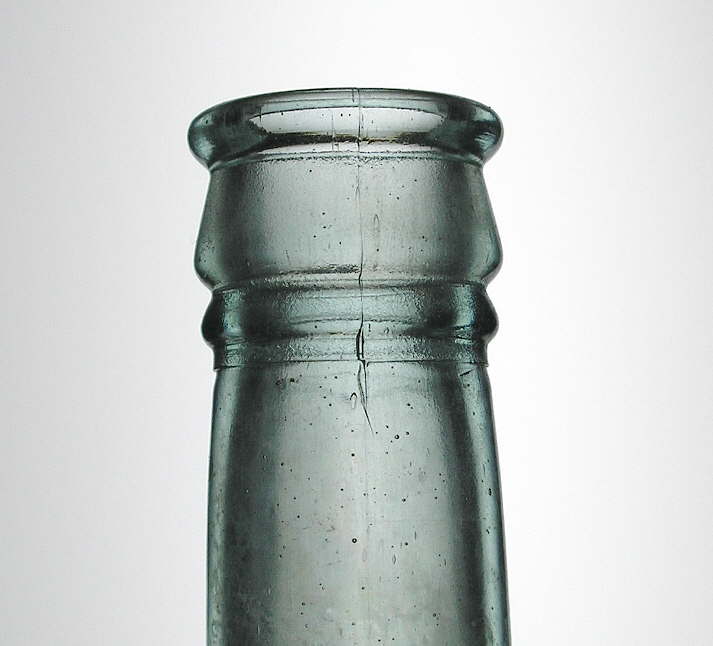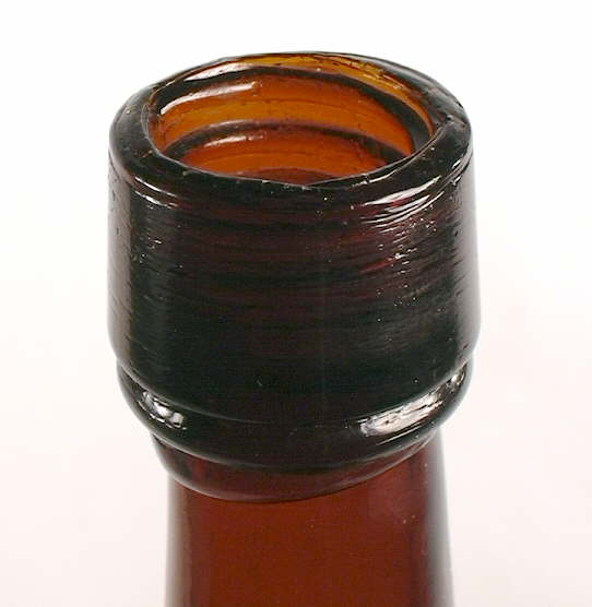 The three-part club sauce finish (it must be three-part to be considered this finish style) is variable but typically consists of a narrow rounded upper part which is typically no wider in diameter than the rest of the finish, a taller flat to slightly rounded outwardly flaring or tapering (from top to bottom) middle part, and a narrow rounded to usually somewhat flared lower collar or lower part. The inside (bore or throat) of the finish usually (but not always) has a "stopper finish" or cork seat ledge similar to the ledge in the capseat finish (#32) above. The shank of the glass stopper that were typically used in these bottle was sheathed by a cork (known as a "shell cork" in glass makers catalogs) which sat firmly on this ledge creating a reasonable seal (Illinois Glass Co. 1920). Click glass and cork stopper to see that section of the "Bottle Closures" page for more information. This finish can be found on applied, tooled, and machine-made bottles dating from at least the 1850s until the 1930s. Because of this long span of use, no dating information can be derived from just the finish itself; other diagnostic features must be used.