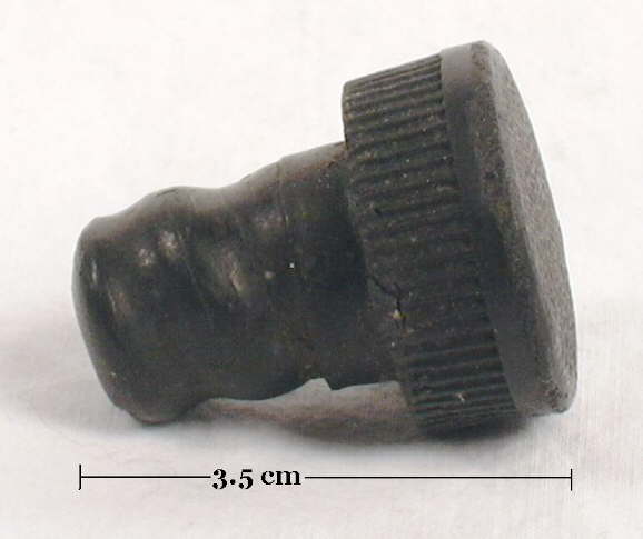 The Benedictine finish on Benedictine bottles are somewhat unique and could be basically described as a two-part finish with an slightly outwardly flaring (top to bottom) upper part with a flaring rounded ring lower part or collar. Sometimes the upper part is more straight than tapered. The collars usually (but not always) have distinct indentations or grooves on both sides to facilitate the wiring down of the cork closure. (Click on the following link to see a picture of an early version with a wired down cork on the Benedictine website: http://www.benedictine.fr/anglais/histoire_frame.html) In a sense, this finish is a reversed version of the reinforced extract (#10) or collared ring finishes (#24) where the flared part is the lower part (collar) instead of the upper part (lip). These finishes are found on Benedictine bottles from the 1870s to well into the 20th century. The pictured Benedictine finish is an applied example on a likely imported Benedictine bottle dating from approximately 1895 to 1910 (based on the context it was found in). It is a bright medium olive green in color with very heavy glass, a domed kick-up base, and was produced in a three-piece mold. Click Benedictine bottle to view a picture of the entire bottle showing the typical embossed crescent on one side (a label was often placed inside the crescent). Note: Finishes very similar to the Benedictine finish - minus the ring grooves - were used on some American made flasks and quart calabash bottles made between about 1855 and 1870. These finishes were described by McKearin & Wilson (1978) as a "tooled, broad flat collar sloping to heavy rounded ring" which describes the Benedictine finish well. These bottles/flasks are usually aqua in color, though other colors are possible. Click Cunninghams & Ihmsen flask to see a ca. 1857-1867 pint flask that exhibits a somewhat vague version of this finish style which is often seen on similar era flasks made in the Pittsburgh, PA. area during the mid-19th century. |