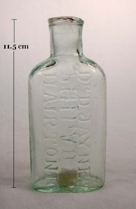 The aqua crudely rolled finish (folded-in) to the immediate right is on a Dr. D. Jayne's Hair Tonic (Philadelphia, PA.) bottle that dates from the 1850s (the base has a blowpipe pontil scar). This is a typical rolled finish as found on quickly and cheaply produced medicinal and other utilitarian bottles made during the 1840s, 1850s, and at least early 1860s.
