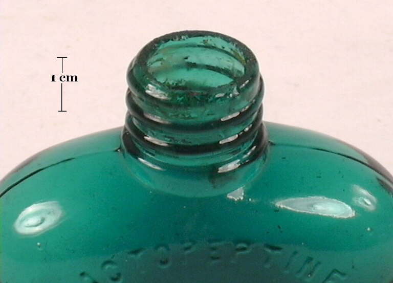 The distinct feature of this finish is the pouring spout created to facilitate the slow, even removal of liquid contents - see pictures. Pouring spouts can occur on finishes formed by most all of the major finish manufacturing processes covered in Part I: cracked-off, sheared, applied, tooled, and machine-made. The majority of bottles with a pouring finish were intended for the bulk sale of ink - a type of liquid that one generally wanted to pour in a slow, controlled manner. However, pouring finishes were also used infrequently on some liquor bottles, occasional medicines, syrup, and rarely other products. Pouring finishes are virtually unknown on soda, mineral water, wine/champagne, and beer bottles. Pouring finishes were used for a long time (and are still used on some syrup bottles) so no dating utility can be derived from its presence (or absence). Pouring spouts have been noted on the following finish types: mineral (#2), bead (#3),patent (#7), packer (#8), prescription (#9), oil (#11), flare (#14), and straight (#15) (Covill 1971; Jones & Sullivan 1989; empirical observations).