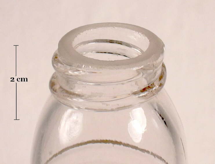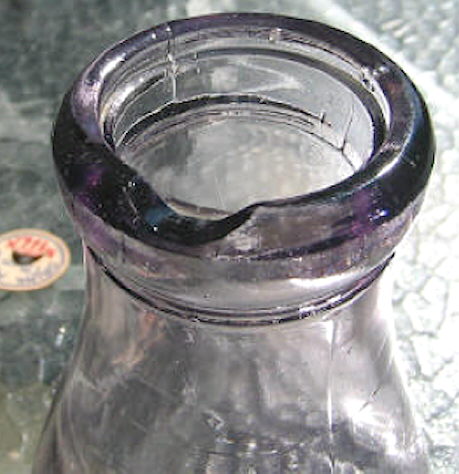This style of closure (and finish to some degree) was patented by the Thatcher Manufacturing Company in September 1889 (click Barnhart's 1889 Patent to see the original patent for the closure) but did not gain widespread acceptance until the precision and standardization necessary for predictable seating and sealing was attained as automatic bottle machines dominated the market in the early 1900s and later, i.e., mouth-blown, tooled finish examples are relatively uncommon (Giarde 1989; Lockhart et al. 2007c; empirical observations). Machine-made milk bottles with the capseat ledge were made by press-and-blow machines where the cap seat itself was formed by the plunger of the neck ring portion of the first parison or blank mold (Lockhart pers. comm. 2007). See the machine-made bottles section of the Glassmaking & Glassmakers page for more information. Also see the Milk Bottles section of the Food Bottles & Canning Jars typology page for more information on the diagnostic attributes that indicate the production of a given milk bottle on typical press-and-blow machines.