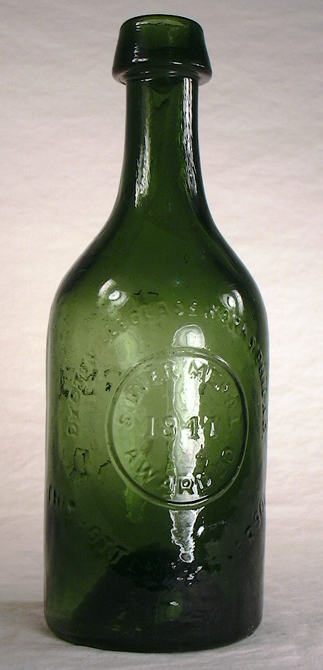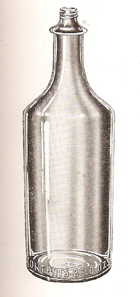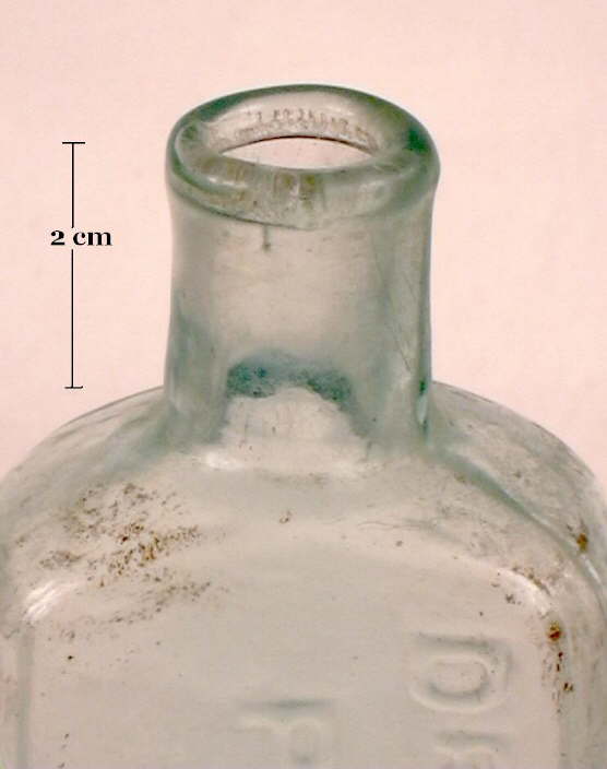 These are also called a "mushroom lip" and sometimes just a "flared finish" (Ojea & Stecher 1998). The design patent for this bottle (November 1883) noted that - "...the neck of the bottle, made with a broad rim at the top resembling a fungus or toad-stool growing out of the end of a log" (Graci 2003). Given this, the mushroom finish is the most historically accurate name. These uniquely "log" shaped bottles are actually relatively common and date from 1883 - when the product was introduced taking the place of the Warner's Safe Bitters and Warner's Safe Tonic - through the 1890s and possibly even into the early 1900s (Seeliger 1974). The Tippecanoe was made with a "true" applied finish to a much later date than most bottles in the late-19th century. This late use of an applied finish was probably a function of the unusual finish which likely defied being produced with purely tooled technology; additional glass had to be added to form this shape. (Note: There is at least one other medicinal "cure" bottle with a similar finish but it is unlikely to ever be encountered due to its extreme rarity.) |