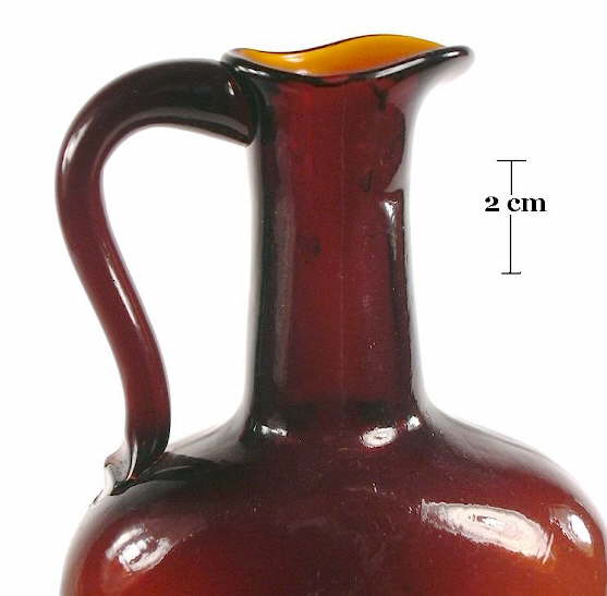 The reddish amber pouring finish pictured to the right is on a Wharton's Whiskey (Philadelphia, PA) that was blown at the Whitney Glass Works (Glassboro, NJ) around 1860 (McKearin & Wilson 1978). This bottle essentially has a straight (#15) or cracked-off (#26) finish that received substantially post-blowpipe tooling to form the large pouring spout (and of course, the addition of an applied handle). Liquor bottles or semi-decanters like that pictured were not too uncommon during the mid-19th century (approximately 1845 to 1875), but were very uncommon on American made bottles outside of that date range. (Note: European-made bottles with applied handles continued until around 1900 and many were imported into this country. They tend to have much smaller, tighter applied handles nestled at the junction of the neck and shoulder.) |