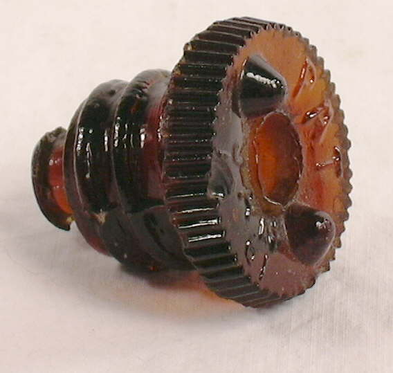 As noted, the ground finish was more a method of finishing than a type of finish, since the functional parts of the finish were fully mold formed and not tooled to shape. Once the bottle or jar is removed from the blowpipe and usually annealed, the rough top surface of the finish (i.e. the rim) was ground down flat to facilitate closure sealing or simply to "finish" the jar. This finish has the following diagnostic characteristics: the extreme upper surface is flat (not rounded at all) and slightly rough to the touch (like fine grit sandpaper); there are usually tiny chips or roughness along the inside and outside edges resulting from the hand grinding process; there is an opaque, sometimes "white-ish" appearance to ground surface; and the mold seam ends right at the outside edge of the extreme upper finish and does not go on to the rim. See the main Bottle Finishes & Closures page for more information. This finish can be found on a variety of different bottle types with differing closures including various jars, liquor flasks (both types usually in conjunction with external screw threads), various wide and narrow bore (mouth) food jars and bottles, though the ground rim is by far most commonly encountered on canning jars made between the late 1850s and about 1910. Click on the following link to view an 1888 patent for a "Glass-Grinding Machine" which shows a fruit jar in place having its rim ground down: Patent #386,738 - Glass-Grinding Machine, July 24, 1888. The amber ground finish/rim pictured above is on a Lightning canning jar which dates from 1882 to the early 1900s (Toulouse 1969a; Creswick 1987). The upper finish part (lip) itself could be called a wide bead finish (#3), though the Lightning finish closure/finish combination is so distinct that it is usually just called that - a Lightning finish and/or wire bail closure (Creswick 1987). Ground, unthreaded finishes like this Lightning jar were very common during that last third of the 19th century until about 1910, on canning jars which accepted various types of glass or metal lids held in place by a myriad of different type closures. (By 1910, the majority of wide mouth canning jars were being machine-made and ground rims quickly faded from the scene within a few years [Toulouse 1969a].) Fragments of these type fruit jars would be very common in historical middens in rural and semi-rural areas, though because of their re-useable nature can be found with much newer items (see deposition lag).