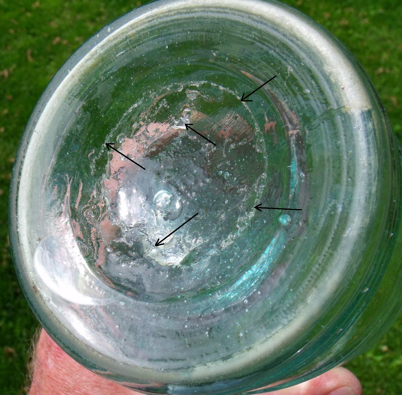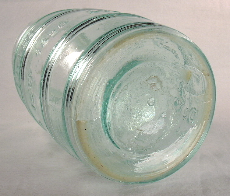 The noted patent was granted to Joseph Borden of Bridgeton, NJ. who assigned it to David Potter and Francis Bodine who were the proprietors of the Bridgeton Glass Works. This jar was blown with a purposefully molded "bulging ring" around the outside of the finish-to-be area, to which "...pressure (was) applied to the top of the jar and ring by means of a former which embraces the neck of the jar and enters the mouth..." which (to cut to the chase) compressed the molded projecting ring into the upwards flaring outer ring on the jar. The patent claims various reasons this is an improvement over the previous methods which included the previously discussed applied "pressed laid-on ring" manufacturing method as well as the apparently oldest method of forming the groove by the simple application of downward pressure via the blowpipe while the jar was still hot from the mold (Creswick 1987). Click Borden's 1858 patent to see the original patent which describes and illustrates how this finish was made. This quart jar was blown in a post-base mold, has a pontil scarred base (a large disk or glass tipped type), is about 7" tall and 3.5" wide at the base, and is very crudely made reflecting its early manufacturing time. Click on the following links for more images of this jar: reverse side of the jar showing the patent date; view of the jar base; close-ups (close-up 1; close-up 2) of the disk or glass tipped pontil scar with various parts of it pointed out with arrows as it is hard to photograph well.