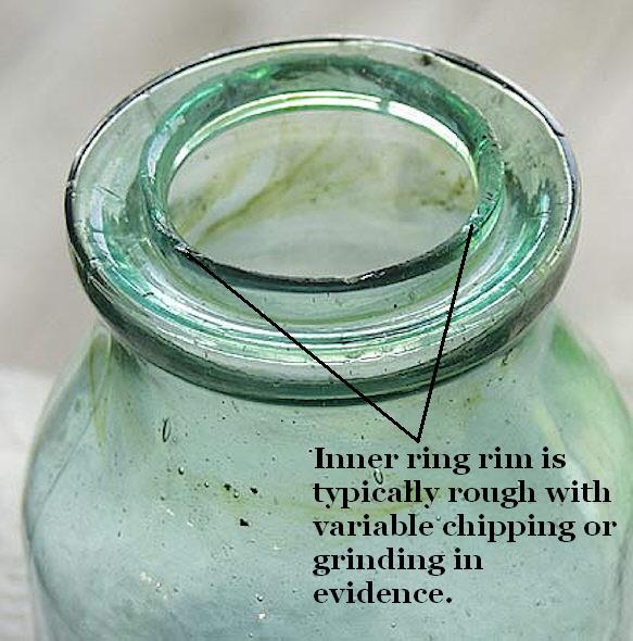 The pictured applied groove ring finish is on a San Francisco Glass Works (California) produced quart fruit jar dating largely from 1869 to 1876 (business years for that glass works), though the two known molds for these jars (quart and half gallon) were likely used in production as late as the early 1880s by the company's successor - the San Francisco & Pacific Glass Works (Toulouse 1971; Creswick 1987; Hinson 1995). This general style of jar was produced in quantity by scores of different companies throughout the U.S. in both quart and half-gallon sizes. Though frequently embossed like the pictured example, these early type canning jars are more commonly encountered with either base embossing or no embossing at all (Toulouse 1969a; Creswick 1987). This style of jar is discussed on the Food Bottle & Canning Jars typology page. Non-applied glass groove ring wax seal finish: These less commonly encountered groove ring wax seal finishes were produced utilizing glass that was blown in the mold along with the rest of the jar - not applied after blowpipe removal. Instead the glass just below the blowpipe removal point was manipulated with a special "former" tool (first jar) or mechanically via a mold part (second jar) when still in a plastic state (possibly reheated if necessary) to form the outer ring and annular groove. A couple non-applied glass finish forming methods are discussed below as well as mention of the oldest method which was just manipulation with the blowpipe: