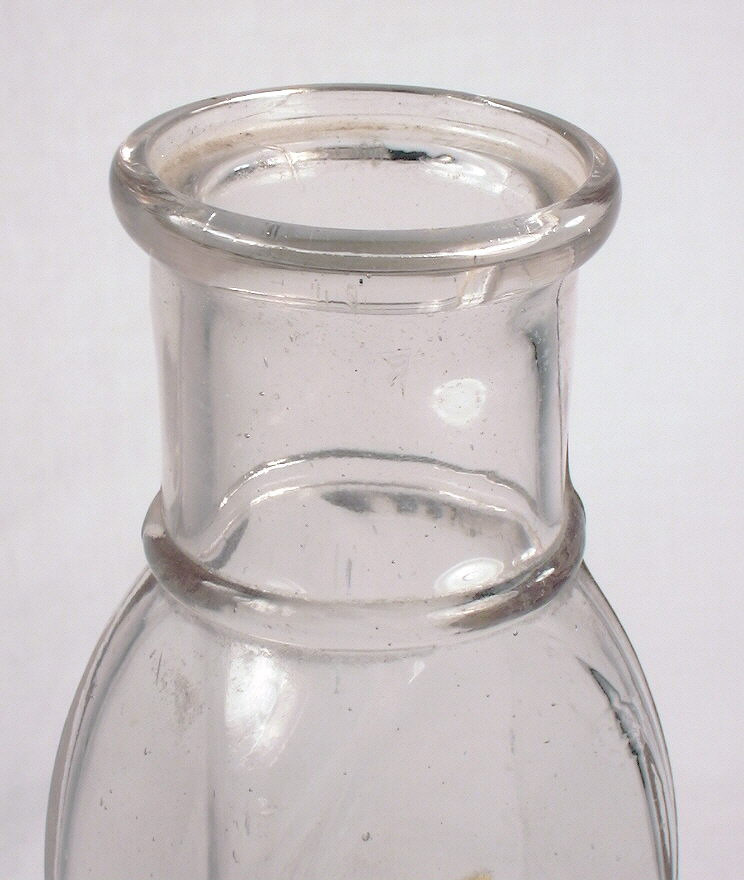 The light olive-yellow bottle to the left is an early American free-blown utility bottle with a relatively wide bore and a simple bead finish (#3) which was formed by rolling (with a tool) the hot glass outward onto the extreme upper portion of the neck. This bottle could have been used for anything from snuff to mustard to medicinals and likely dates between 1790 and 1820 (McKearin & Wilson 1978). Folded or rolled-out finishes are probably less common than folded-in finishes though they are found frequently on larger mouth (bore) utility and pickle/food bottles. That this finish was formed by rolling the upper neck glass and not formed with applied glass (i.e. applied finish) can be ascertained by running ones finger just inside the bore of the bottle and noting the absence of a crease or groove where the sheared/cracked neck and applied glass meshed. The inside portion of this particular finish is smooth and seamless to the touch indicating that the upper neck glass was simply "pushed" out from the bore and on to itself. (See the Finishes page section on the rolled finish method for more information.) |