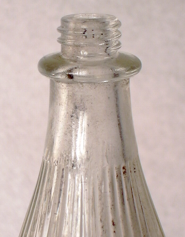 The distinctive feature of this finish style are the continuous type threads which are found on the inside of the finish. This finish is by far the most common on mouth-blown tooled finish liquor bottles made between the late 1880s and National Prohibition in 1920, and in particular between 1890 and 1915. This era's bottles virtually always had the hard rubber type stopper shown in the colorless bottle pictured to the left (Wilson & Wilson 1968; Munsey 1970)). During this era a few other types of bottles were made with inside threads including some soda/mineral waters (mostly foreign made), chemical and/or ammonia bottles, perfumes and colognes, and some ink bottles (Elliot & Gould 1988; empirical observations). An earlier and much less common type of inside thread finish with a glass stopper is also found on mineral water, beer/ale, and liquor bottles and flasks dating between 1861 and the mid-1870s. These different variations are covered below. The colorless, tooled inside thread finish above (inside of a straight brandy finish) is on an S. A. Arata & Co. (Portland, OR.) pint flask that dates between about 1905 and 1911 (Thomas 1998a). Inside thread finishes on flasks were much less common that on cylinder fifths and quarts of that era, but was common enough to warrant mention here.