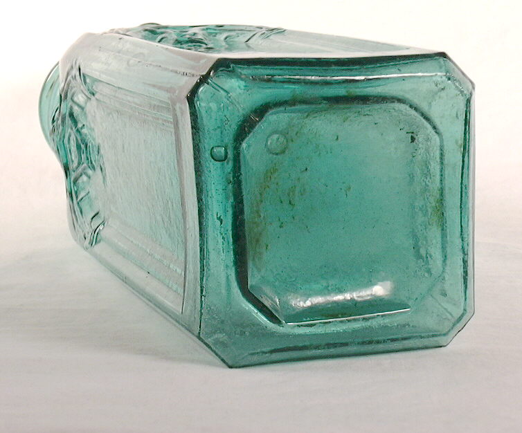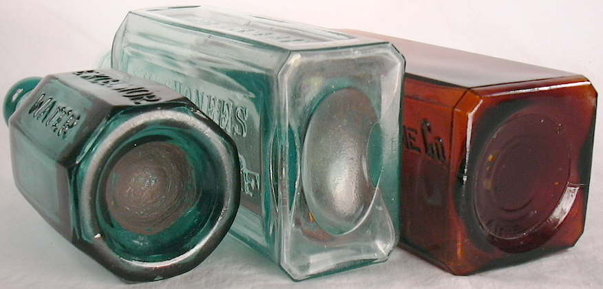 The bottles pictured above right are almost identical bottles for the same product. Both are embossed: GROVES TASTELESS / CHILL TONIC PREPARED BY / PARIS MEDICINE CO. / ST. LOUIS. The bottle on the right is mouth-blown with a tooled finish and cup-bottom mold conformation to the base with no other markings. The example on the left was made by an Owens machine showing a very distinct and slightly feathered suction scar that curls around the side of the bottle on the back (lower side in the picture). Click the picture to view a larger version to see the details better. Both of these bottles are also discussed in depth as an example of the transition from mouth-blown to machine-made manufacturing on the Bottle Finishes & Closures page.