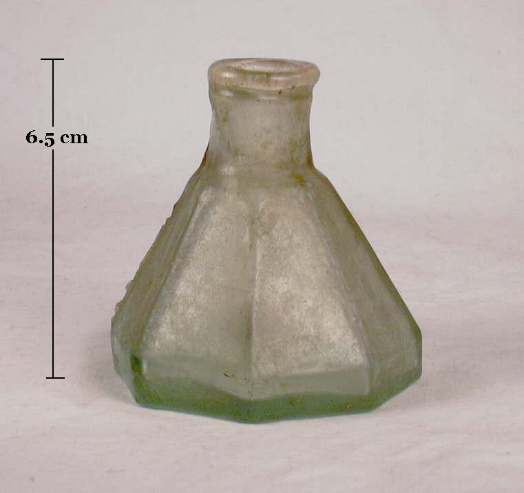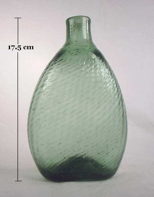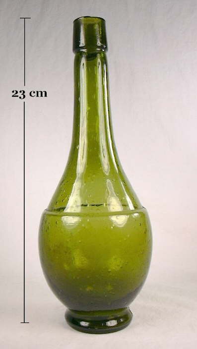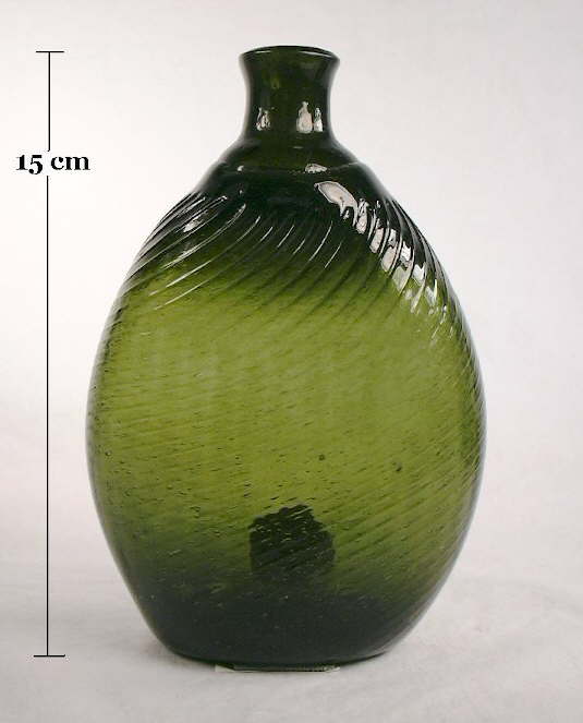 For example, the American made free-blown bottle pictured to the left which is commonly called a "New England chestnut" could have been - from purely a manufacturing technique perspective - blown in Europe several hundred years earlier or in ancient Rome two thousand years ago (bottle to the right ca. 100 A. D.). The actual production date range for these bottles was 1780 to the 1820s (Scoville 1948; McKearin & Wilson 1978; Cable 1999; Griffenhagen & Bogard 1999; Van den Bossche 2001). (This "chestnut" bottle is described further on the Examples of Dating Historic Bottles page.) Although the shapes are different, both pictured bottles were produced with identical methods - free-blown, pontil scarred, with applied finishes.