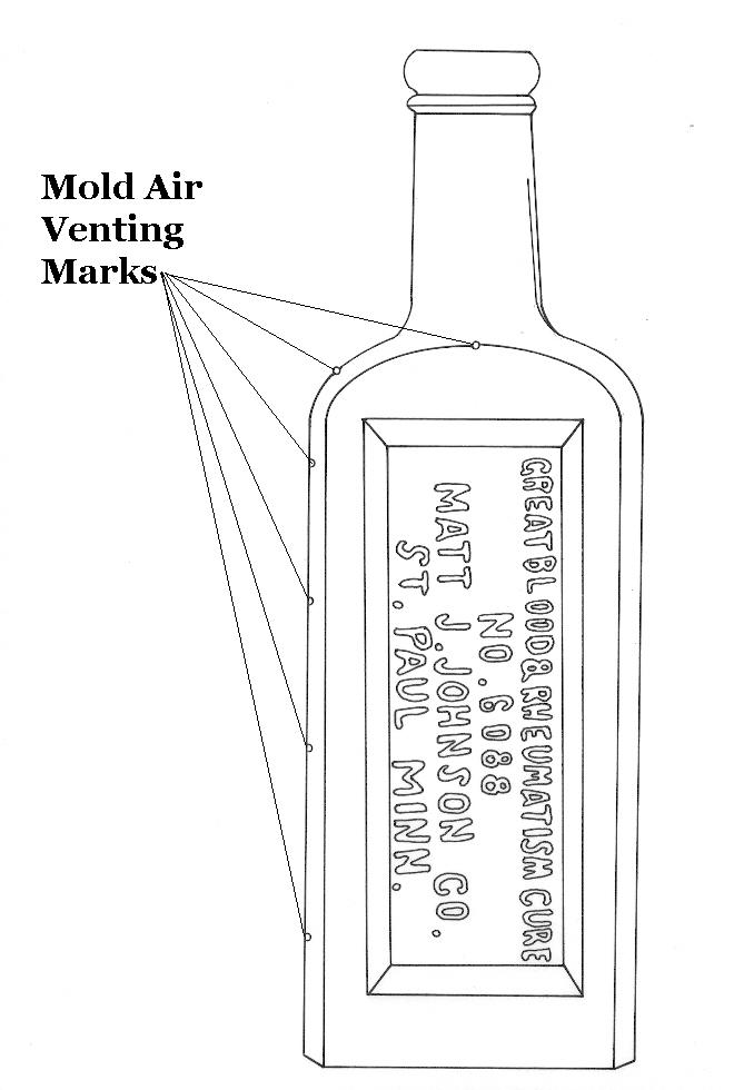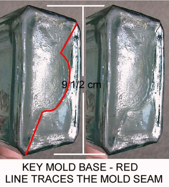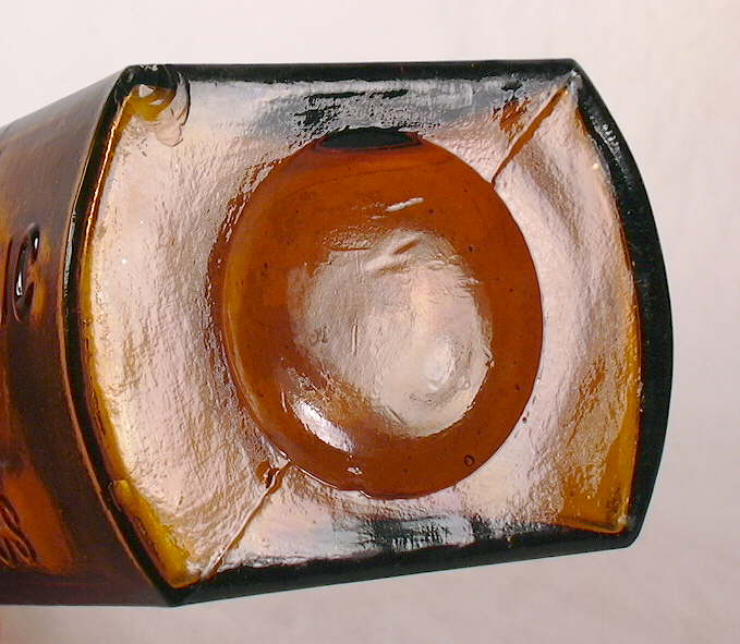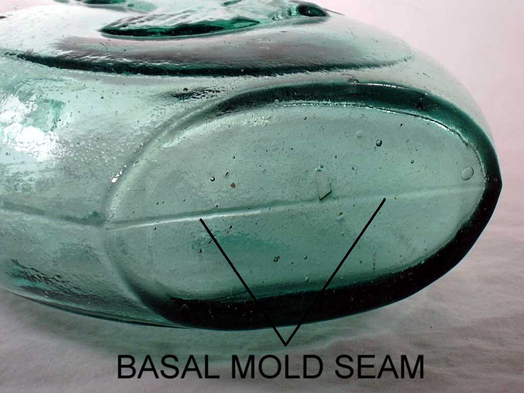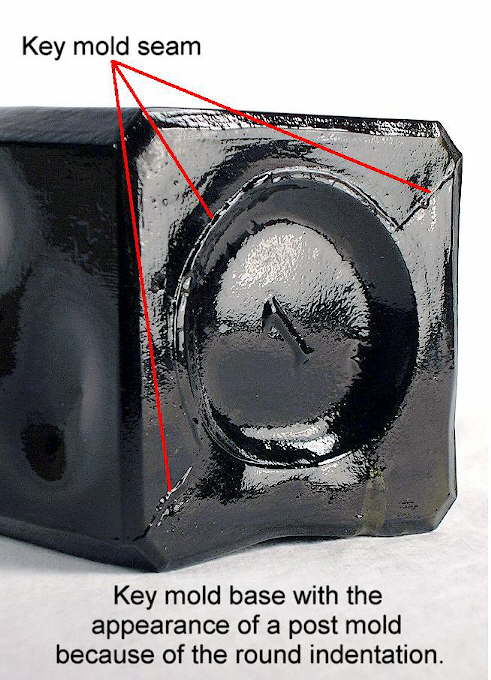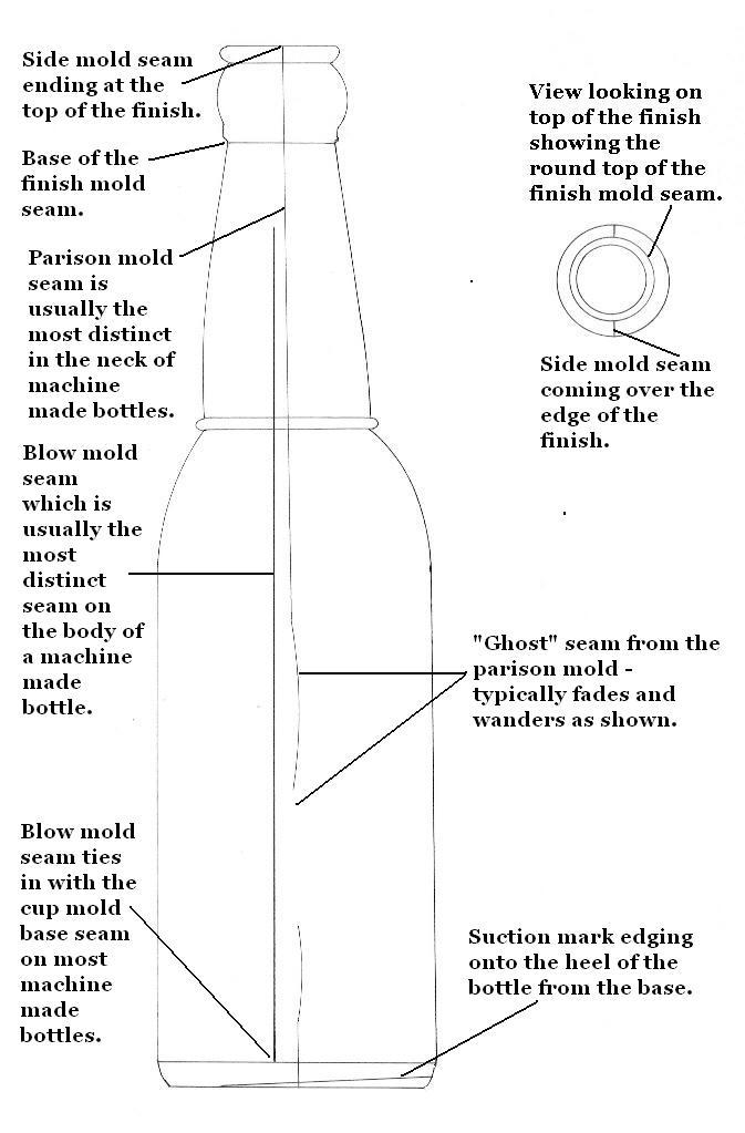 This feature on the base (and body) of the bottle is also, as noted, called a "parison mold seam" or "parison mold line." These features (base and side parison mold lines/seams) are portrayed and pointed out in the image above (click to enlarge). These machine-made base markings never have the "feathering" of the true suction scar; otherwise these type bottles share the same diagnostic features as the Owens Machine produced bottles as covered on the Bottle Dating: Machine-made bottles portion of the Dating Key.