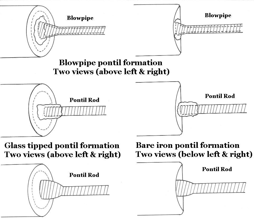 The following outlines the basic types of pontil scars and how they were formed. For much more information consult the Pontil Marks or Scars page. |