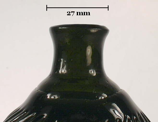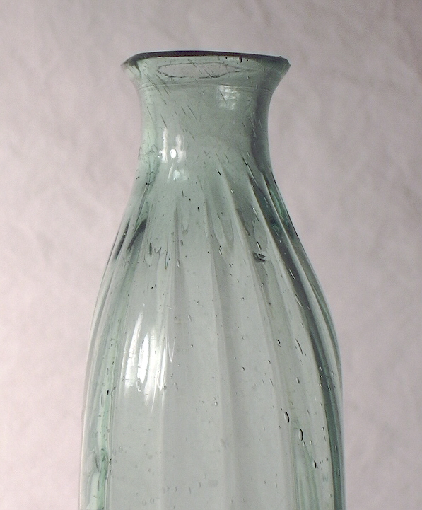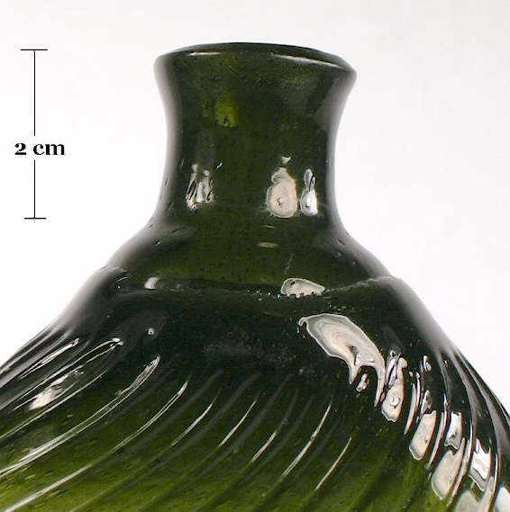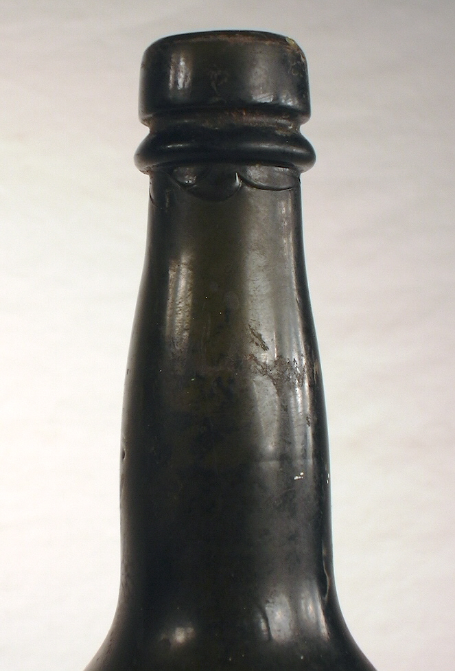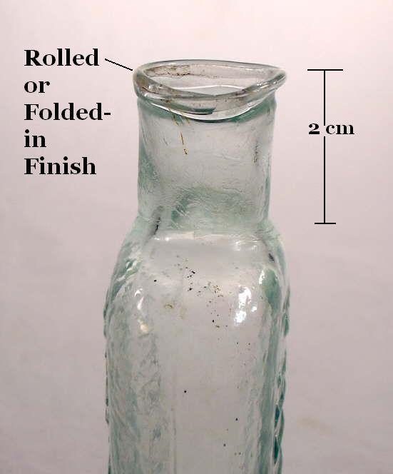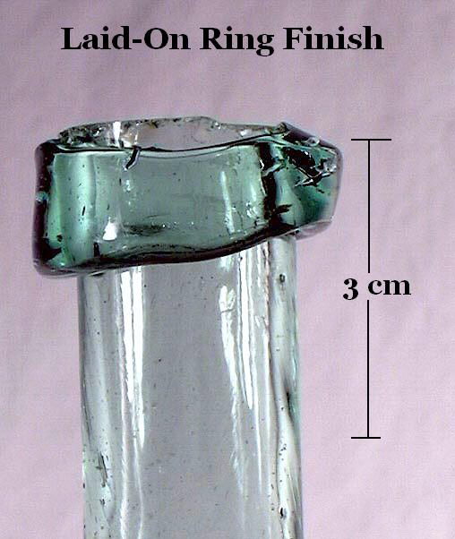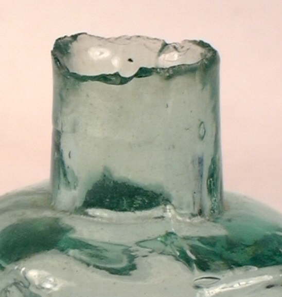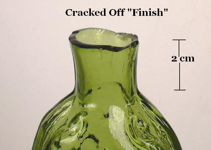 At this point in the glassblowing process the bottle is now "finished," which is usually the application and/or manipulation of glass at the bore/throat of the bottle to form a lip and/or collar of some type. Finishing and many related issues, including wetting or cracking-off (an example pictured to the right on a mold-blown bottle), are covered in depth on the main Bottle Finishes & Closures page and will not be extensively covered here. The primary physical characteristics of a free-blown bottle are found on the Bottle Body Characteristics & Mold Seams page.