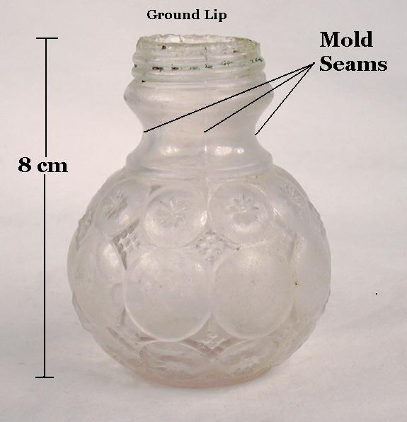 When the rod was broken free of the bottle, a generally round but fragmented scar was left behind on the base of the bottle. This is usually manifested primarily by an assortment of glass fragments protruding above the base of the bottle. In addition, the rod would usually take with it some small glass fragments from the base of the bottle leaving a scar which is a round scattering of "bumps and gouges" without a distinctly unmarred center - like the blowpipe pontil scar described below. Click on the picture to the left to see an enlarged version of a typical glass-tipped pontil scar that shows the detail better. (Click sauce bottle to view a picture of the entire bottle.) The glass tipped pontil scars are usually about the same diameter of the orifice or upper neck of the bottle - like the blowpipe pontil scar which is discussed next - but for reasons unknown (unlike the blowpipe pontil scar which is explained next). For more information click glass-tipped pontil.