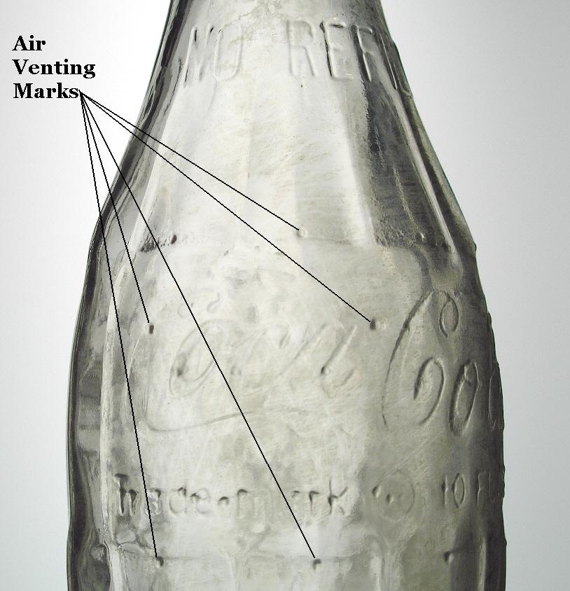 There are no noticeable diagnostic differences (to the bottles produced) between semi-automatic machine induced characteristics and those of fully automatic machines except that the earlier Owens machine often left a distinctive "feathered" suction scar which seems to be most pronounced on the earlier (1920s and before) Owens machines. The general diagnostic features of a machine-made bottles are covered in some depth on the Bottle Dating: Machine-made bottles portion of the Dating Key or briefly in the illustration that is available by clicking on the amber beer bottle above right.