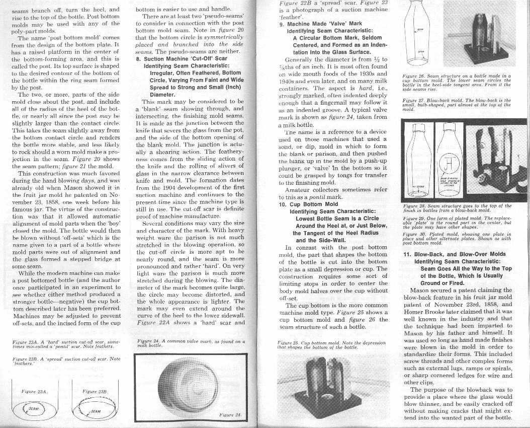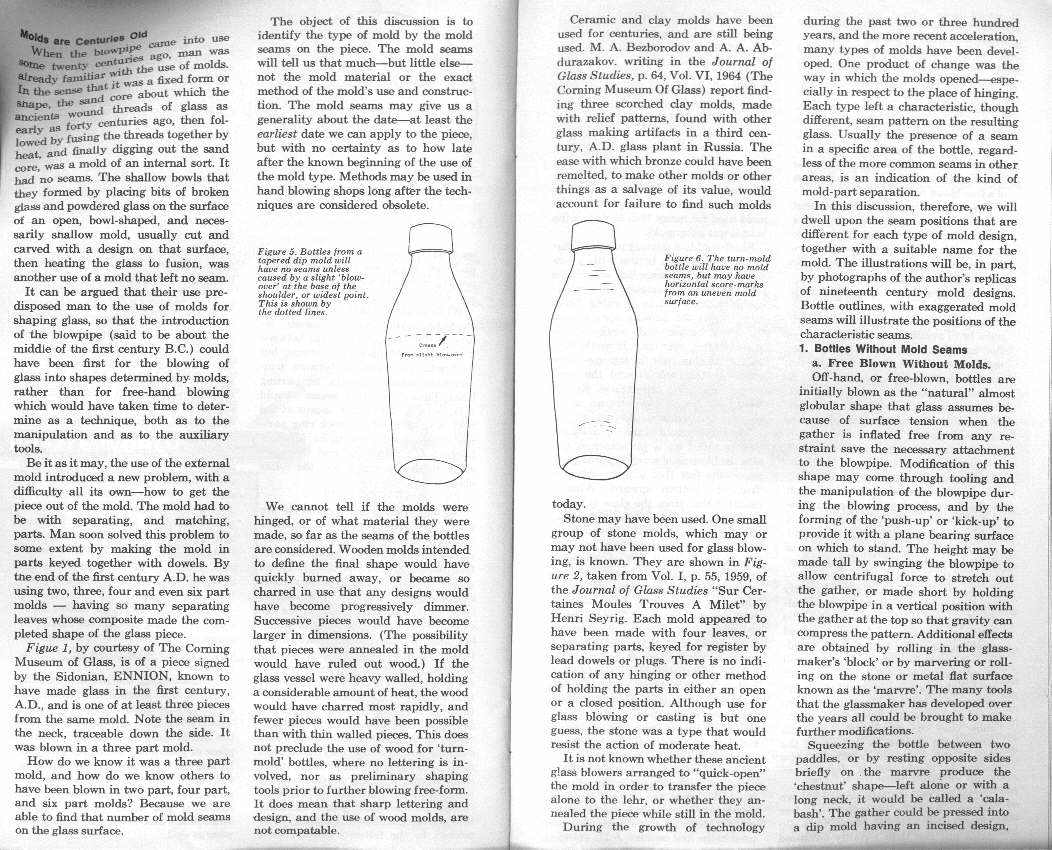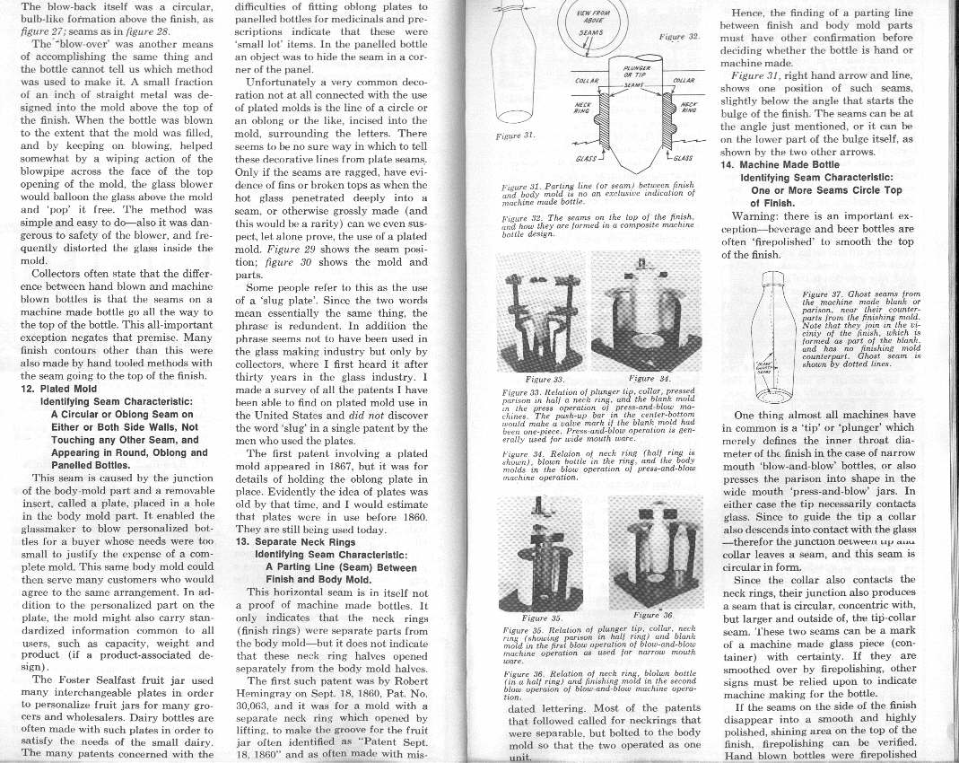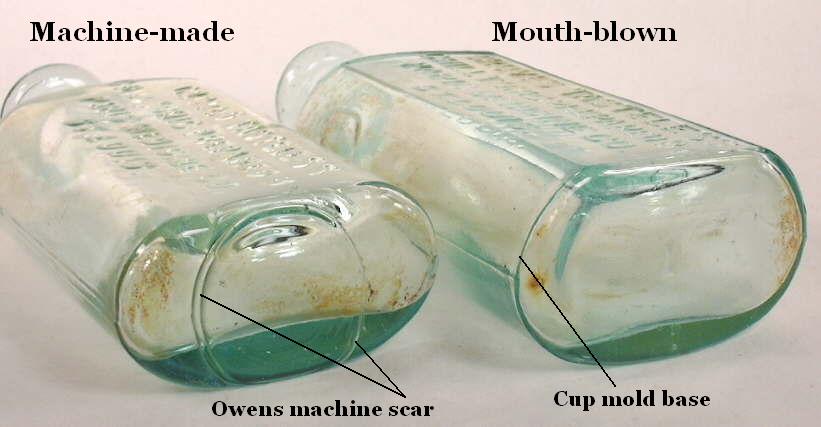 "Knowing the techniques of glassblowing, including how to identify bottles made by hand, either free-blown or mold-blown, and by automatic methods, is a valuable help in dating bottles."