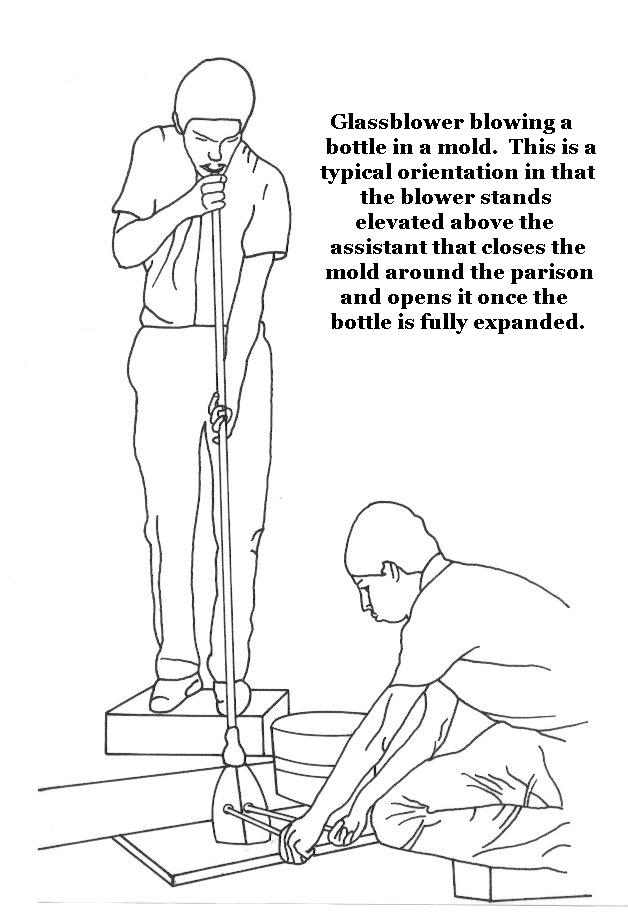 "Glassmaking & Glassmakers" Related Pages A. Mouth-blown Manufacturing - This section addresses the manual processes for making bottles, used prior to automation of the industry, where the bottle was blown/expanded with the power of human lungs; thus the term "mouth-blown."