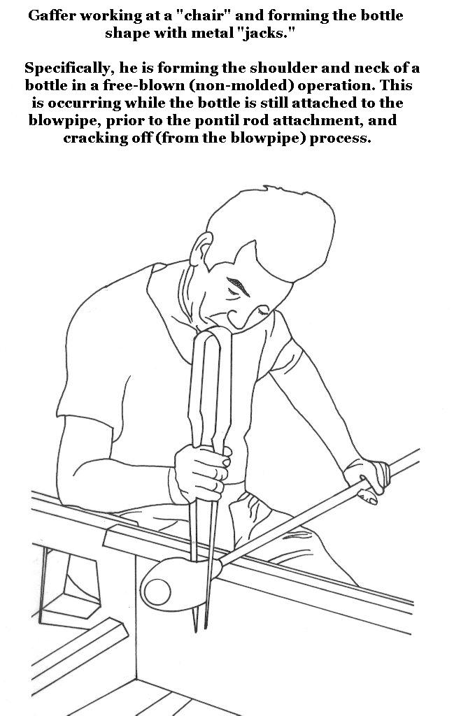 To take the final steps necessary in forming a free-blown bottle the gaffer sits at a workbench called a chair. The blowpipe is placed across the arms of the chair, which are tilted downward away from the gaffer, and is gently rotated during the completion period. The most important tool the gaffer uses at this stage is the pucellas, a tong-like instrument more often called a tool. (Click chair use to view an illustration of these processes; click "chair" used for modern day art glass production to see a modern example of a chair in use by a Canadian glassblower. [Photo courtesy of Bill Lockhart]) As the blowpipe is rotated the tool is sometimes used to narrow the neck of the bottle in preparation for finishing (completing the neck and mouth). Shears resembling tin snips are sometimes used to cut the plastic metal - for example, glass to be made into handles. At this stage the bottle is ready for the final manipulations of finishing...