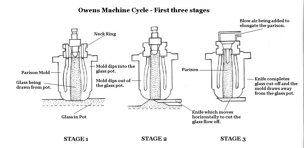 Most bottles today are still made by Individual Section (I. S.) Forming machines. Since modern bottle making is beyond the scope and coverage range of this website, we direct you elsewhere. The Owens-Illinois Glass Company maintains a very nice website that includes a short section on their glassmaking past and present, including information on their current glassmaking process as well as decoding their more recent makers marks: http://www.o-i.com/about/corporate/glassmfg.asp