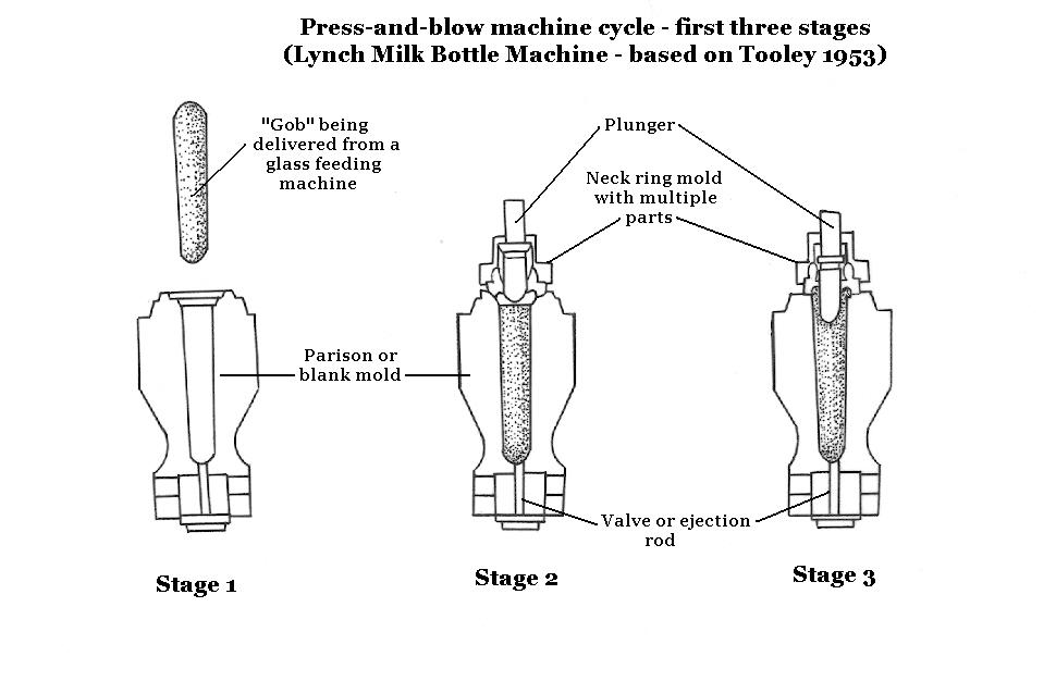 As noted, the suction scar is the diagnostically distinctive mark found on the base of many bottles produced by the Owens machine (and possibly, on bottles produced by other later suction based machines). The mark is a result of the mechanical "knife" which cuts off the glass being drawn upwards into the parison mold via a suction process once enough glass is drawn to produce the desired bottle (World Book Encyclopedia 1958). Click Owens machine cycle - stages 1-3 to see an illustration of a portion of the Owens machine cycle which shows schematically how the knife cuts off the glass (Stages 2 and 3). Click Owens machine cycle - stages 4-6 to see the rest of the cycle where the parison is moved from the parison mold to the blow mold for full expansion of the bottle (after Tooley 1953). These two illustrations together show the general process that the Owens machine uses. A different illustration of the Owens machine operation from the 1958 World Book Encyclopedia is available by clicking Owens Machine Illustration. These illustrations also typify the general cycle of all automatic blow-and-blow machines, except for how the glass is fed into the parison/blank mold. The process for press-and-blow machines is very similar except that the parison is mechanically "pressed" (not blown) into shape by a plunger or piston in the generally one-piece (not including the neck ring) parison mold (Miller & Morin 2004). To view illustrations of how press-and-blow machines operated, click on the following links: press-and-blow machine cycle - stages 1-3; press-and-blow machine cycle - stages 4-7.
