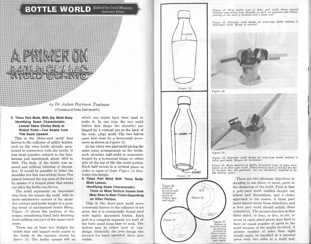 The following is quoted from the introduction to the book Bottle Makers and Their Marks by Dr. Julian Toulouse and is one of the better quick summaries on the subject of maker's marks pertinent to the goals of this website. (Note: Dr. Toulouse wrote his book from the perspective of assisting collector's as well as archaeologist's as implied in the following quote.):