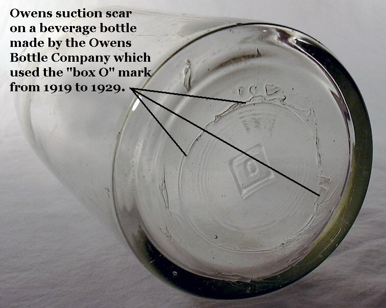 Bottles with suction scars date no earlier than 1905 and typically are after about 1910 when the Owens machine really accelerated its climb towards the dominance of the bottle market. By 1917, 90-95% of the bottles in the U.S. were being made by machine with fully half of the total made by the Owens machines (Barnett 1926; Miller & Sullivan 1981). Thus, half the American made bottles from the late 1910s would have suction scars. Apparently as time passed the Owens engineers discovered a combination of technique, glass formula, and glass temperature that eliminated the feathering on the Owens bottles (Miller & Morin 2004). A very roughly cut-off suction scar like shown in the picture is usually the product of an earlier Owens machine, i.e., 1905 through the 1920s, though suction scars with some minor roughness have been noted into the 1930s (Lockhart pers. comm. 2005; empirical observations). It is known that various patented improvements were made to the machines in the early 1930s that appear to have resulted in cleaner, less "messy" scars (Lockhart pers. comm. 2006). Without this feathering the suction scar can be virtually indistinguishable from the parison induced base marking produced by other types of machines; see the "Modern (non-Owens) Bottle Making Machines" section below for more information. The Owens machine dominated the bottle market through most of the 1920s, though by the end of that decade, gob feeder machines surpassed the Owens machines in production with only 30% of U.S. production being Owens machine produced by 1947 (Miller & Sullivan 1981). The last Owens machine in the U.S. reportedly shut down in 1982, though they could still be in use in other countries (Miller & McNichol 2002). It should also be noted that by the 1920s, competitive and often smaller, European suction based machines (e.g., Redfern, Wilzin, Severin) were also competing with the Owens machine and likely induced some type of base suction mark on the bottles like that formed by the Owens machine since the parison/blank mold glass feeding process was the same (Pearson 1928).