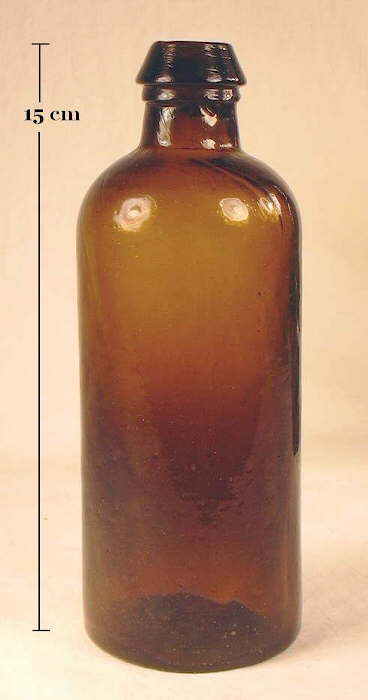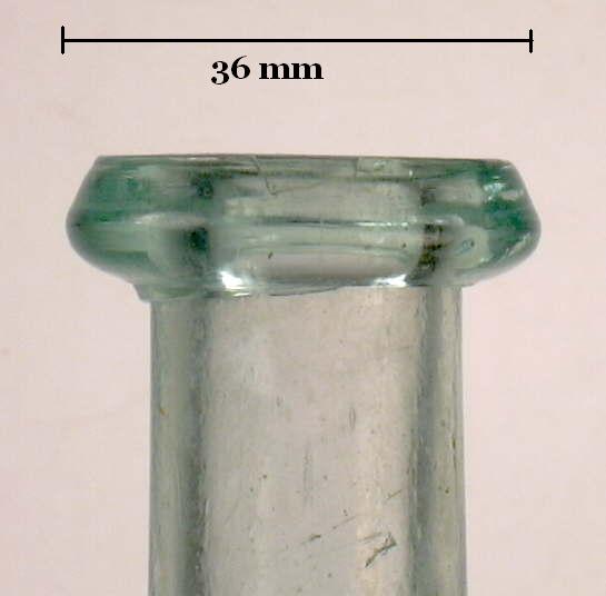 Applied finish (or lip) - Also called a "true" applied finish or lip. Applied finishes are a category of finishes where the glass for the finish was "applied" in a separate process after the bottle was severed (wetted or cracked-off) from the blowpipe. (Click applying a string finish to view an illustration of the process of applying this glass.) After the finishing glass was applied to the severed bottle neck - often with additional re-firing to keep the finish soft and workable - it was then "tooled" to form the desired shape and dimensions. Virtually all finishes had some tooling done on them to form desired shapes - even many sheared finishes. What differentiates the applied finish from the tooled finish is the separate application of glass to the neck end; this was not done in the process that produces the tooled finish discussed below. The process of "applying" a finish usually results in some amount of excess glass "dripping" down below the bottom edge of the finish, as shown in the picture to the right. See the applied finish section of the Bottle Finishes & Closures main page for more information.