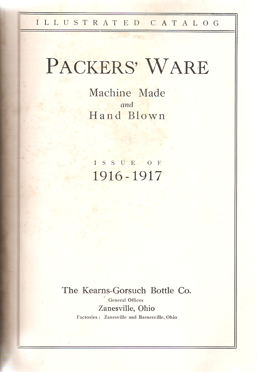 Because of this utility to archaeologists and collectors alike, I have reproduced the entire 1916-1917 Kearns-Gorsuch Bottle Company (KGBCo.) catalog on this website; a catalog never reproduced to the authors knowledge although a few examples of it are known to be in the hands of collectors (empirical observations). This catalog was titled "The Packers' Handy Reference Book" (cover to the right) indicating the market niche the company was aiming towards. The KGBCo. was located in Zanesville, OH. and was a large producer of various bottles, though specialized in bottles and jars for commercial packers of various food products. This catalog shows the large array of food bottles and jars the company produced, as well as a smattering of other bottle types with lesser variety.