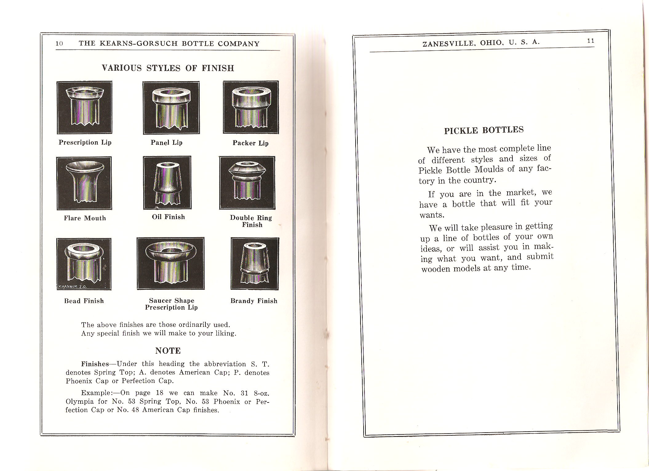 Pages 10-11: Illustration of Various Styles of Finish / Pickle Bottles