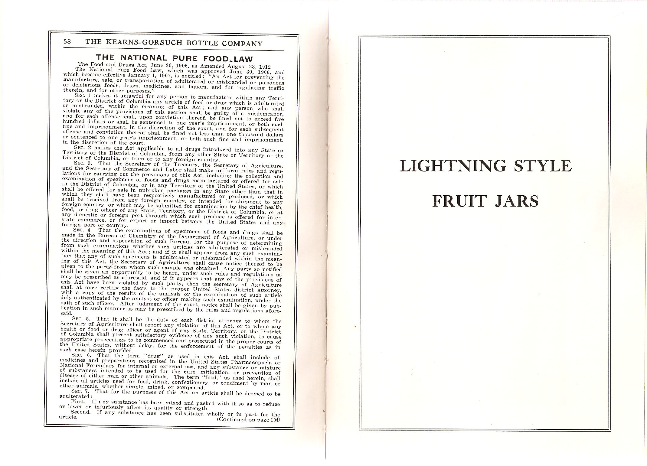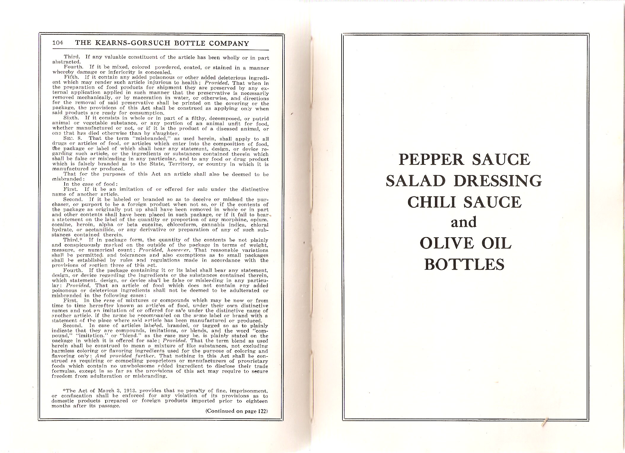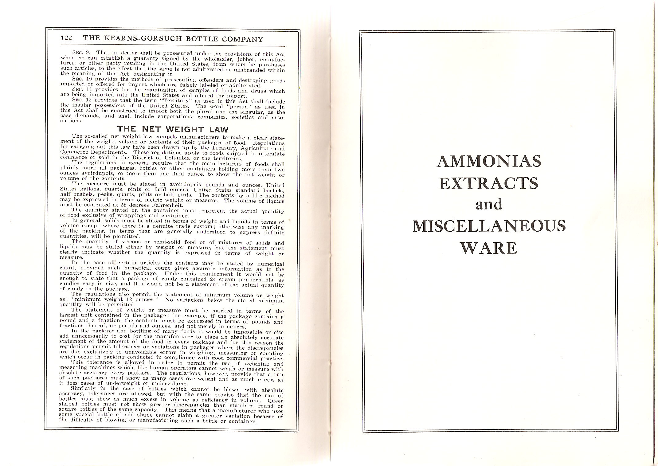 Also of notable interest are pages 58, 104 and 122 which in combination outline the details of "The National Pure Food Law - The Pure Food and Drugs Act, June 30th, 1906, as Amended August 23, 1912." (Page 104 also includes a reference to the Gould Act of 1913 which specified the period for compliance to take place.) This is apparently an entire copy of the amended law which includes the original act details as well as a discussion of the "The Net Weight Law" amendment from 1912 which "...compels manufacturers to make a clear statement of the weight, volume or contents of their packages of food." The 1912 amendment, in hand with the Gould Amendment (March 3rd, 1913), required the clear labeling of the contents of bottled products. This is a useful dating tool for bottles having such (on the label or embossed in the glass) since very few bottled products had such designation prior to these laws which in combination required compliance no later than September 1914 (Lockhart 2006a).
