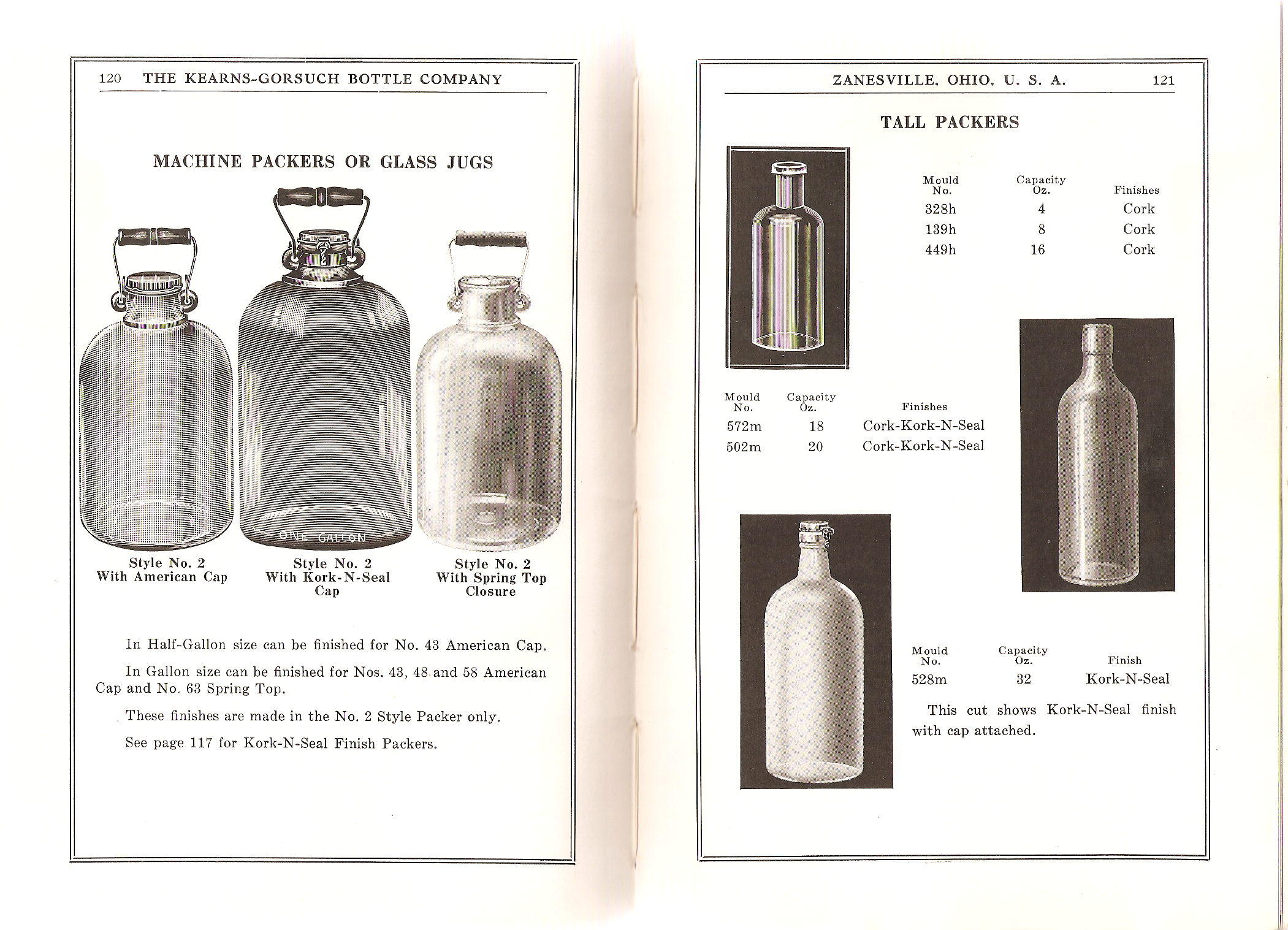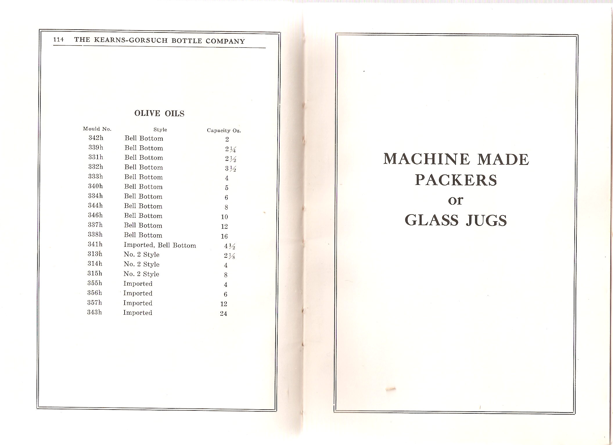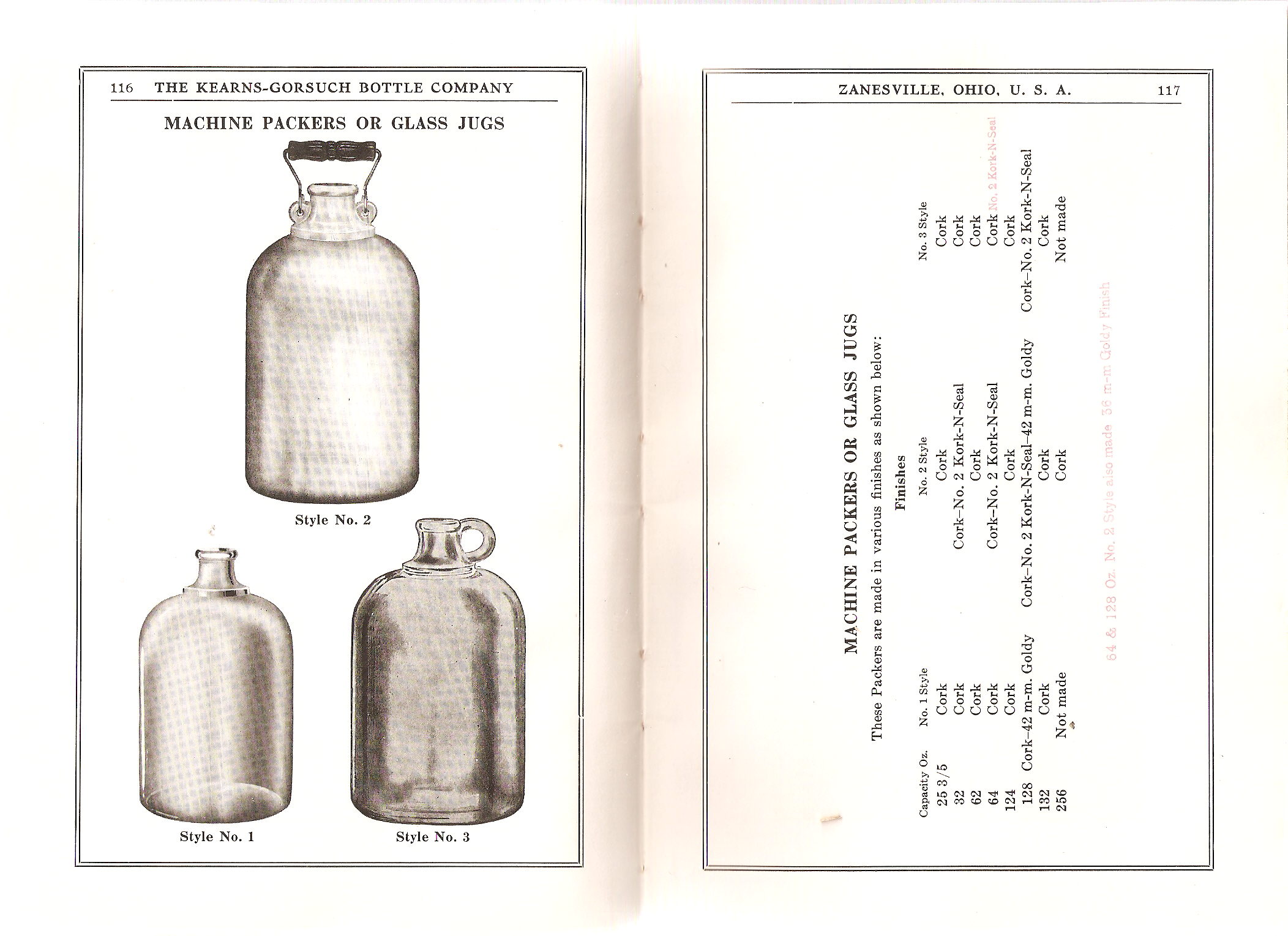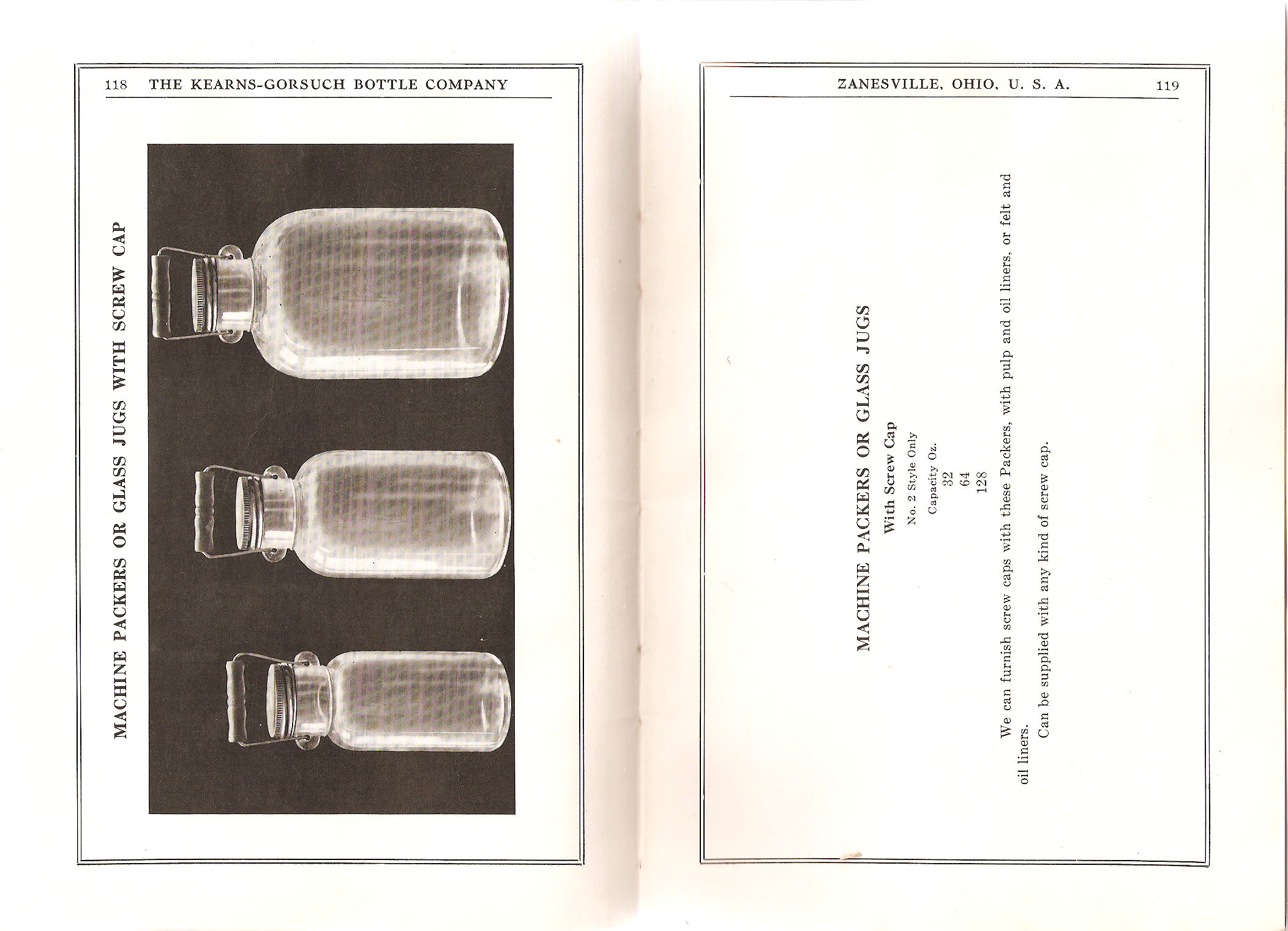 Pages 116-117: Machine Packers or Glass Jugs / sizes & details information